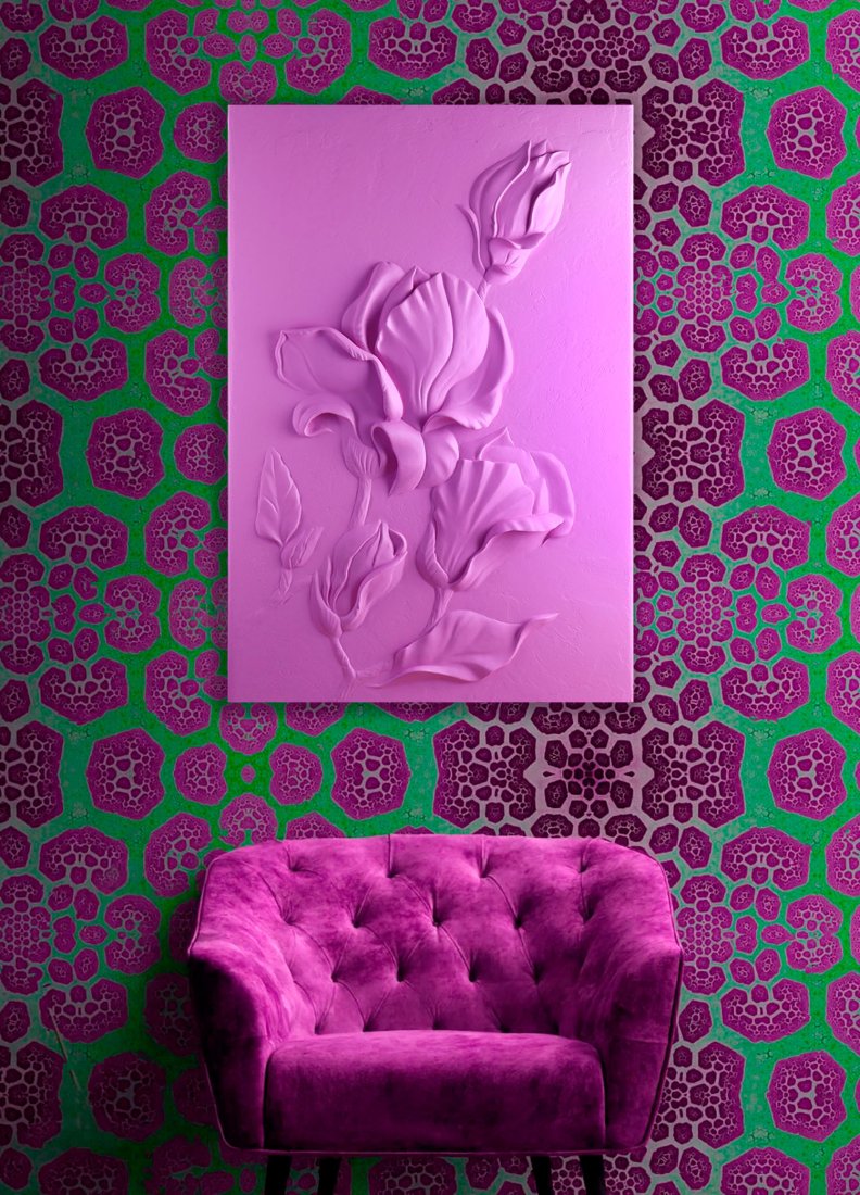 Myślałam, że kolorowa płaskorzeźba będzie dobrze wyglądać wyłącznie na białym tle, tymczasem na tapecie z kontrastowym wzorem prezentuje się naprawdę fascynująco. Również dobrze będzie wyglądać na jednolitym tle w odcieniach fioletu, zieleni, burgundu, złota - tworząc wyjątkową, elegancką kompozycję. Strukturalny obraz Magnolia w kolorze magenta wniesie do wnętrza pulsującą energię, doda przestrzeni wyjątkowego, artystycznego charakteru i luksusowego wykończenia.