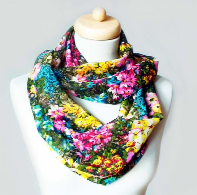Bardzo efektowny komin, szal tuba, uszyty z pięknego kolorowego szyfonu w kwiaty. Szal jest dość wąski, uszyty z dwóch warstw. Oryginalny dodatek do płaszcza, żakietu, sweterka.