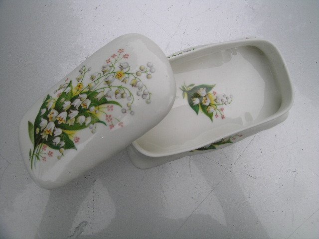 Spore Porcelanowe Puzderko. Sygnowane FINE BONE CHINA Made in England. Porcelana w kolorze ciepłej bieli i miłe dla oka kolorowe,wiosenno-majowe bukiety; Nawet niewielki napis z jednej strony MAY :) Ciekawy,niespotykany kształt; Falbankowy dół. Wykończenie satynowo- błyszczące. Porcelana gatunkowa,choć ma od spodu przykrywki maleńki zadziorek / nie uszczerbek!!/ - wadę fabryczną. Rant górny jakby spod ręki czyniony,nie z formy :)