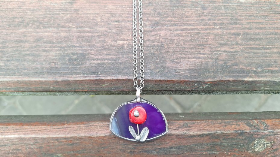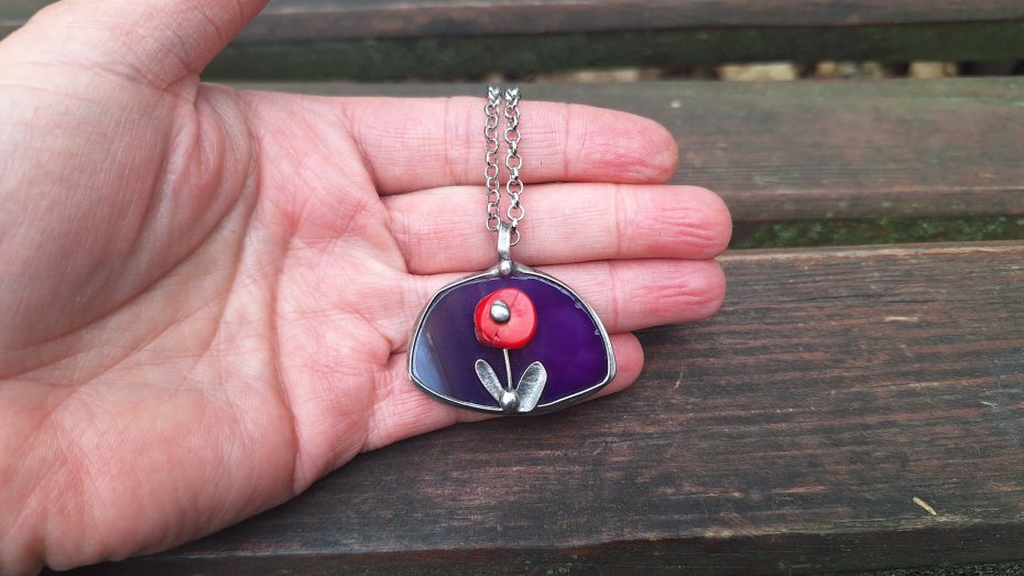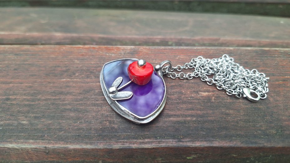 Wisiorek wykonany z miedzi, cyny, agatu i koralowca. Wymiary ok. 3 na 4 cm. Zawieszony na łańcuszku o długości ok. 50 cm.