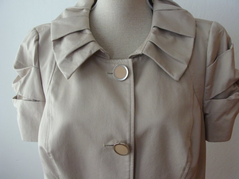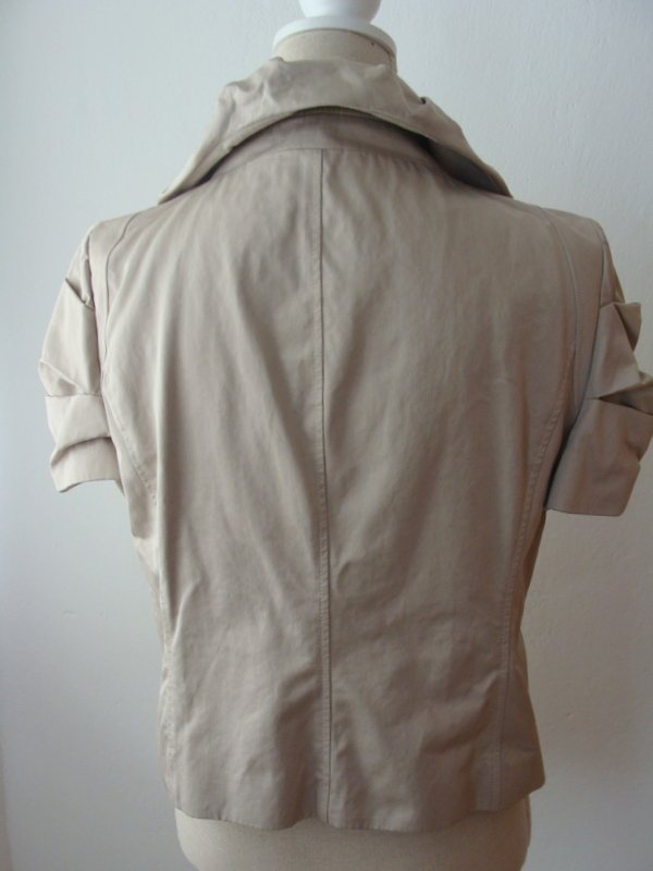 Elegancki, bardzo ładnie skrojony i uszyty żakiet o ciekawym fasonie, w kolorze chłodnego beżu z lekko oliwkowym odcieniem Okrągły kołnierz z ozdobnymi zakładkami.. krótkie rękawki ozdobnie formowane, u dołu dwie skośne patki w szwach środkowych imitujące kieszenie . Zapięcie na trzy duże guziki idealnie komponujące się z żakietem. Całość na podszewce.