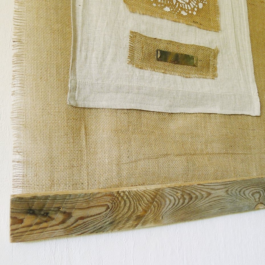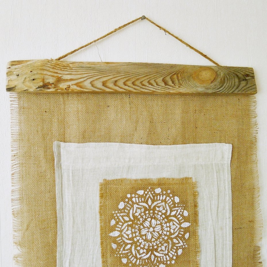 Makata, dekoracja ścienna wykonana z naturalnych materiałów - tkaniny jutowej, tkaniny bawełniano-lnianej, starych desek, starej blachy mosiężnej, sznurka jutowego. Mandala malowana jest ręcznie farbami akrylowymi.