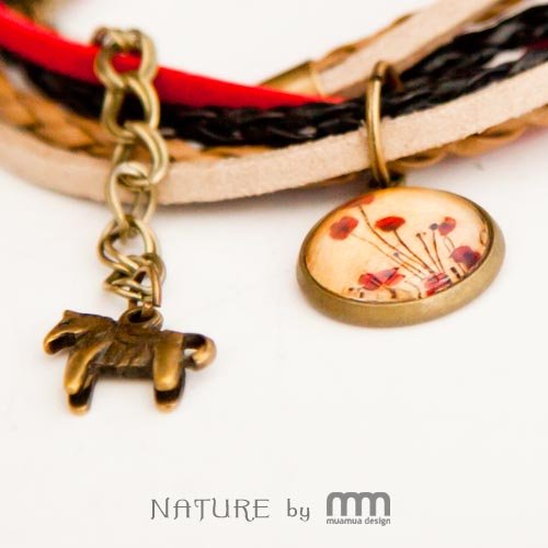 Bransoletka Maki, z możliwością noszenia jako naszyjnik, to bardzo romantyczne, nostalgiczne i kobiece malutkie dzieło sztuki. Obrazek pod szkiełkiem to autorska ilustracja. Bransoletka z kilku rzemieni prezentuje się wspaniale, a zawieszka oraz medalion dopełniają romantyczną stylistykę .