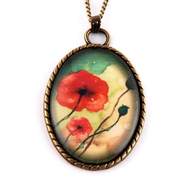 Naszyjnik/ wisiorek "Maki Akwarela" na podstawie obrazu (akwareli) z makami. Obrazek opracowałam graficznie tak, aby nabrał szlachetnej patyny stylowej biżuterii oraz głębi. Oprawiony jest za wypukłym szkłem.