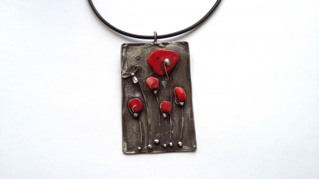 Wisiorek wykonany z miedzi, cyny i koralowców. Wymiary ok. 8 na 5 cm. Czarna linka kauczukowa o długości ok. 45 cm.