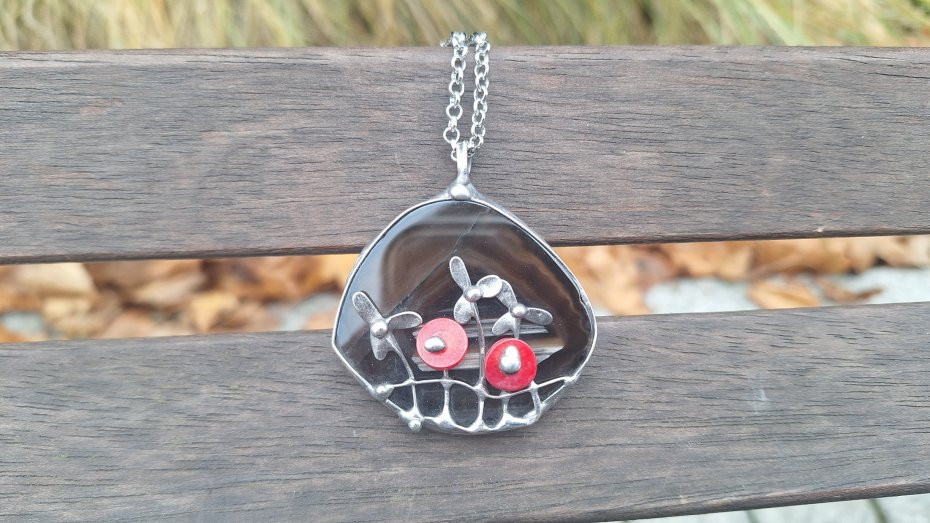 Wisiorek wykonany z miedzi, cyny, koralowców i agatu. Wymiary ok. 4.5 na 5 cm. Zawieszony na łańcuszku o długości ok. 50 cm.