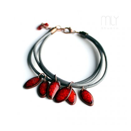 Efektowna bransoletka wykonana ze skórzanego rzemienia jubilerskiego w kolorze szarym, elementów w kolorze miedzianym i ręcznie wykonanych ceramicznych zawieszek, szkliwionych mieszanką czerwonych szkliw z efektem plamek o subtelnym połysku, Obwód regulowany. Polecam