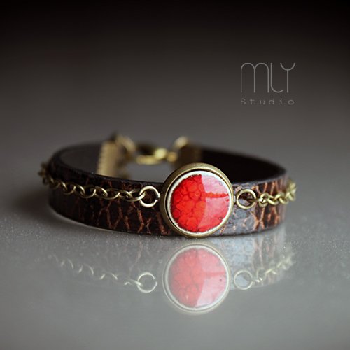 Efektowna bransoletka wykonana z rzemienia jubilerskiego, elementów w kolorze starego złota i ręcznie wykonanej ceramicznej zawieszki, szkliwionej mieszanką czerwonych szkliw z efektem plamek,. Obwód regulowany, długość elementu ceramicznego ok 1,2cm Polecam. Termin realizacji zamówienia to 1-2 dni.