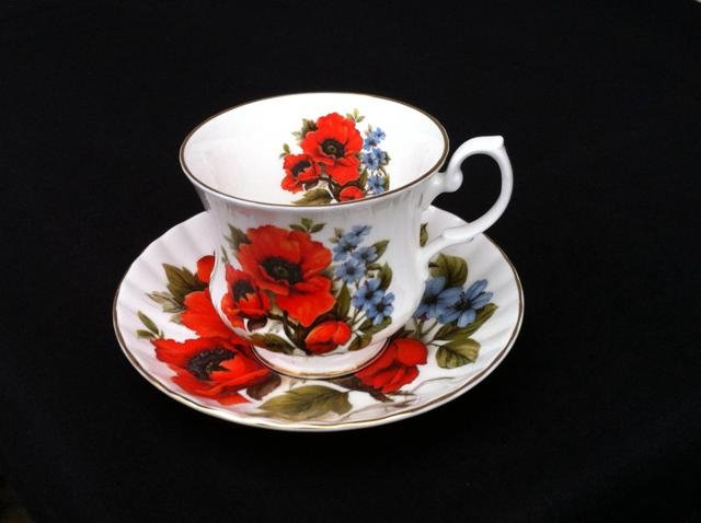 Bardzo efektowna i szlachetnie porcelanowa Filiżanka ze Spodkiem w malarskiej, makowej odsłonie. Sygnowana numerycznie Royal Heritage. Jakość białej porcelany, ozdobne ryflowanie i złocenia. Klasyczna elegancja angielskiej formy herbacianej i feeria kolorowej malatury. Spodek 14 x 2,5; Filiżanka dół 5; góra 8,5; szer. 10; wys. 7,5 cm. Stan zachowania bardzo dobry. Prawdziwa celebracja herbacianego święta :)
