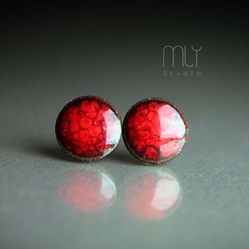 Okrągłe, lekko nieregularne ceramiczne kolczyki w formie sztyftów, ręcznie wykonane z delikatnej gliny kamionkowej, jednostronnie szkliwione intensywnym pomarańczowo-czerwonym szkliwem z efektem plamek i pięknym połyskiem, na sztyftach w kolorze srebrnym. Średnica ok. 9mm.Polecam