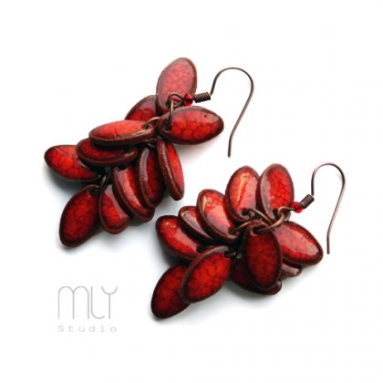 Oryginalne i efektowne ceramiczne kolczyki w formie gronek, ręcznie wykonane z mocno spieczonej gliny kamionkowej, jednostronnie szkliwione mieszanką błyszczących czerwonych szkliw z efektem plamek,na biglach w kolorze miedzianym. Długość około 5cm. Polecam