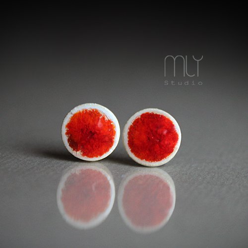 Ceramiczne okrągłe kolczyki w formie sztyftów, ręcznie wykonane z delikatnej jasnobeżowej gliny kamionkowej, jednostronnie szkliwione intensywnym pomarańczowo-czerwonym szkliwem z efektem plamek i pięknym połyskiem i białym szkliwem o perłowym połysku, na antyalergicznych sztyftach w kolorze srebrnym.Średnica ok. 9mm.. Polecam
