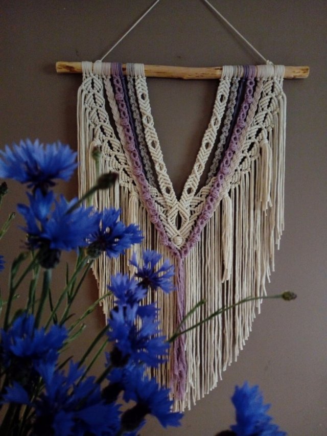Ta makrama odnajdzie się we wnętrzach zaaranżowanych nie tylko w stylu skandynawskim, boho i klasycznym. Idealna do niewielkich pomieszczeń i sypialni. Makrama została upleciona ze sznurka bawełnopodobnego w kolorach Natura, szary, brudny róż oraz fiolet