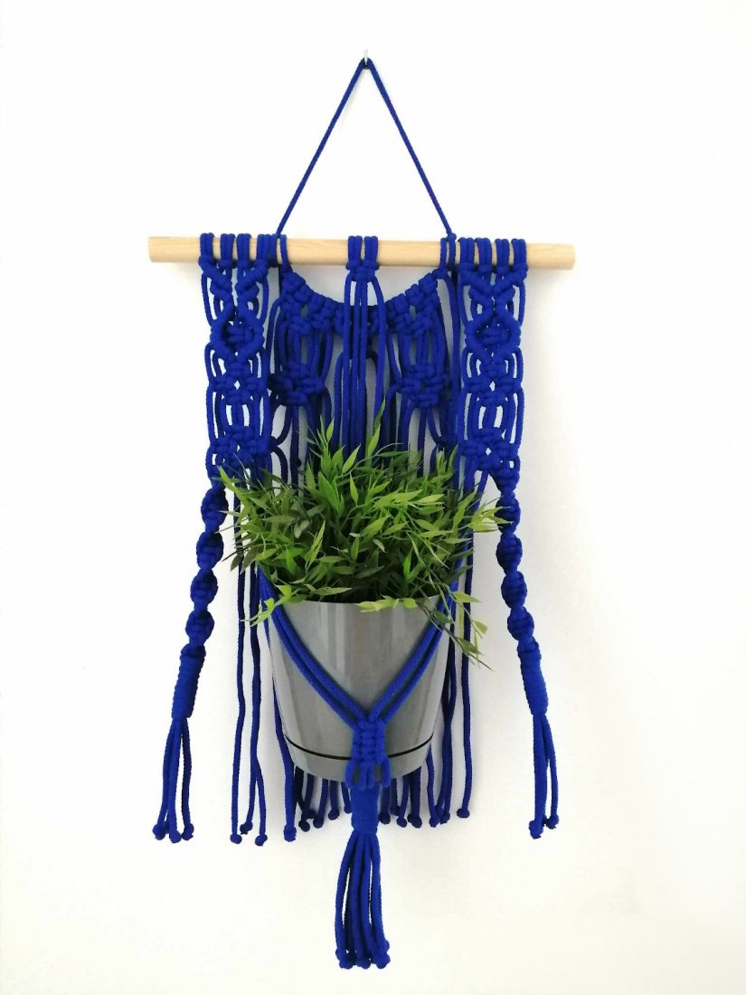 Kwietnik w pięknym kolorze chabrowym jest nie tylko praktycznym rozwiązaniem dla Twoich roślin, ale również przyciąga wzrok swoim wyjątkowym wzorem i estetyką. Wykonany ręcznie z najwyższej jakości sznurków makramowych, stanowi prawdziwe dzieło sztuki, które wzbogaci każde pomieszczenie.