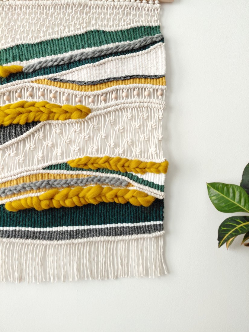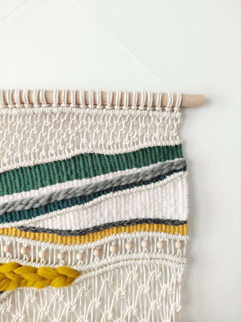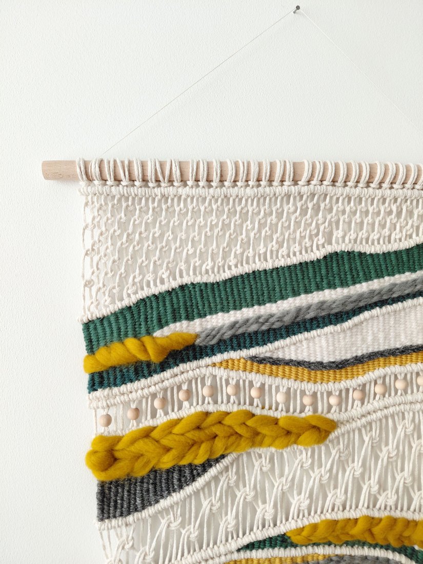 Dekoracja ścienna wykonana techniką macraweave, będącej połączniem makramy i gobelinu.