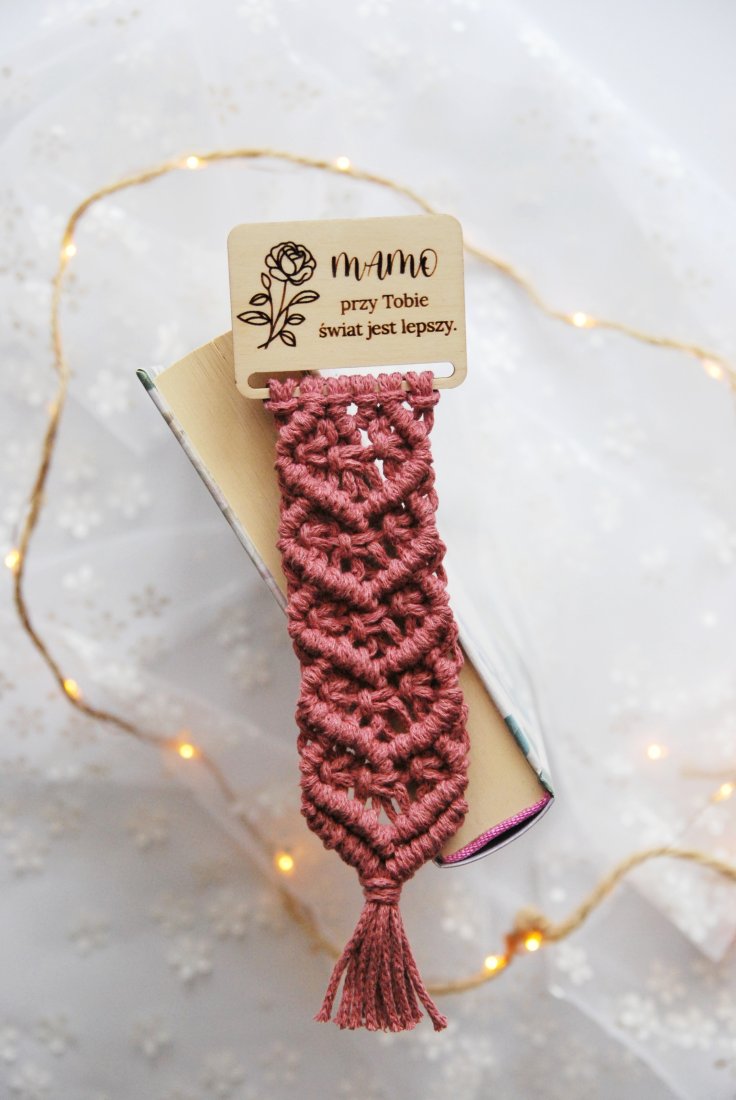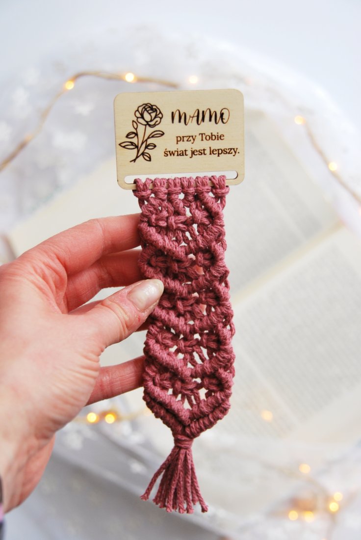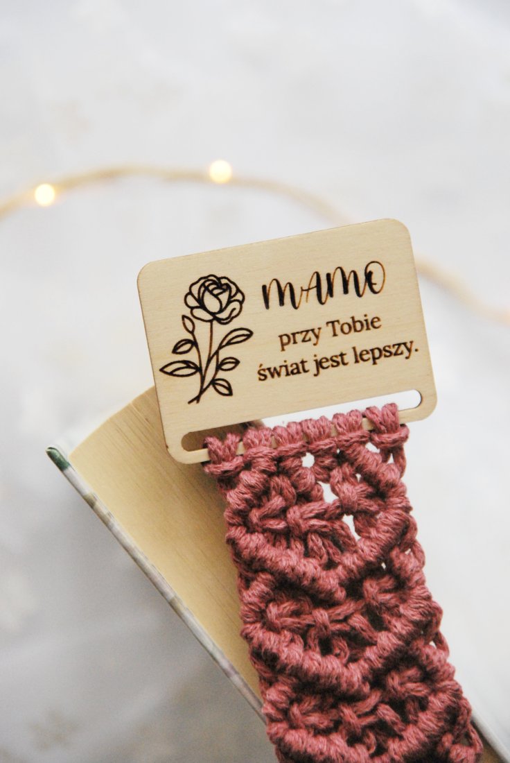 Ręcznie pleciona z bawełnianego sznurka w ciepłym, różanym kolorze, z drewnianą bazą z wypalonym napisem: "Mamo, przy Tobie świat jest lepszy." Proste słowa, które mówią wszystko.