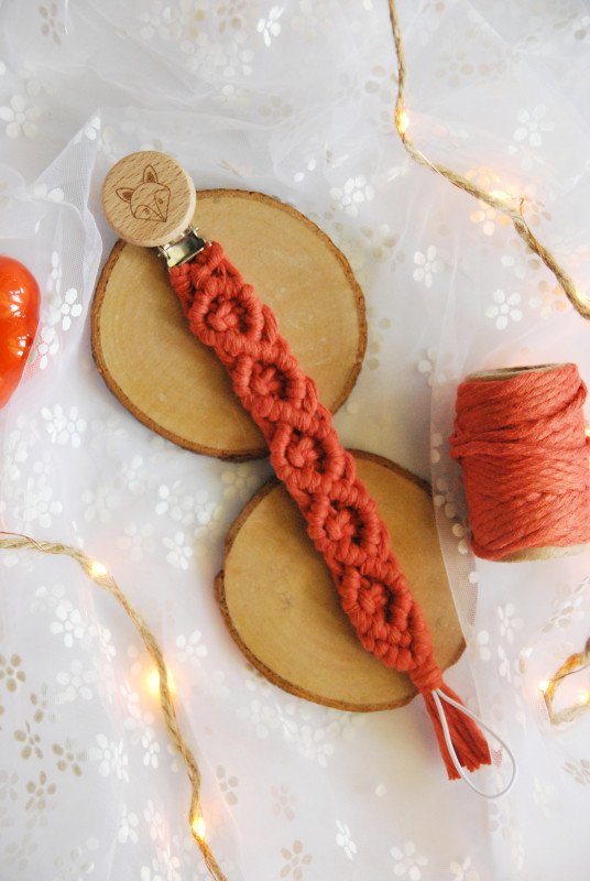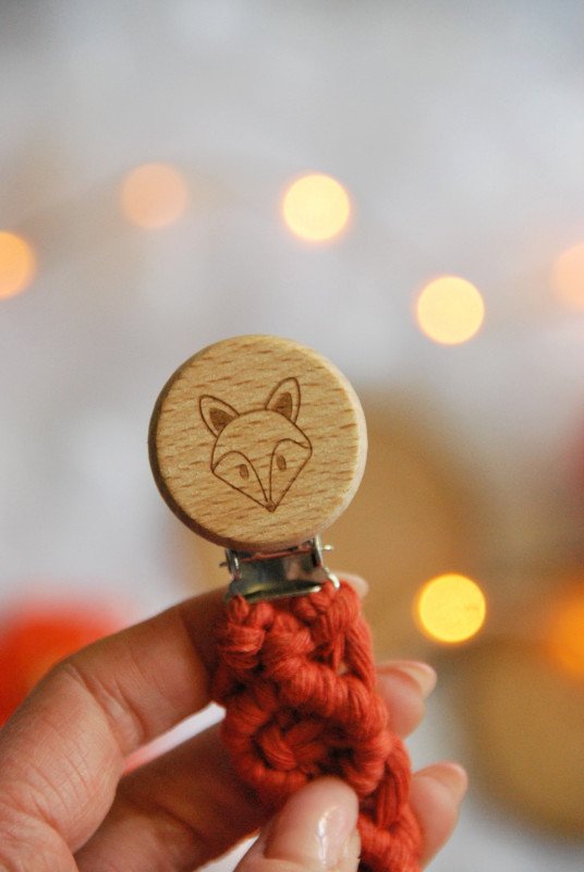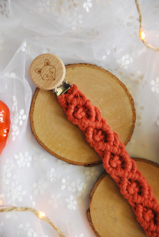 Stylowa i praktyczna zawieszka do smoczka wykonana ręcznie techniką makramy z najwyższej jakości bawełnianego sznurka w ciepłym, rdzawym odcieniu. Drewniany klips z wygrawerowanym motywem uroczego liska dodaje zawieszce naturalnego uroku i jest bezpieczny dla maluszka.