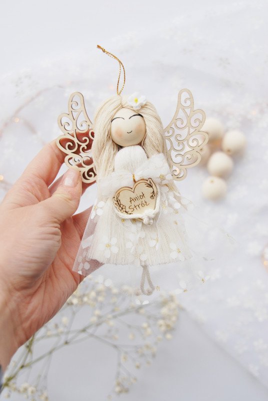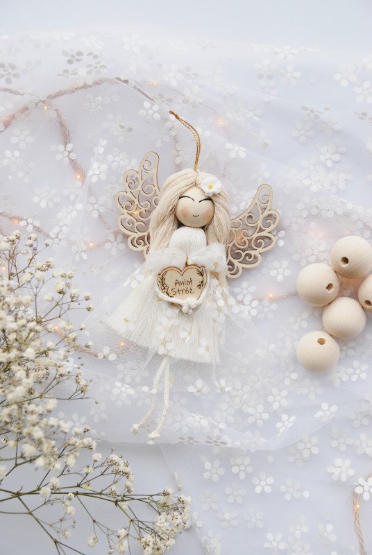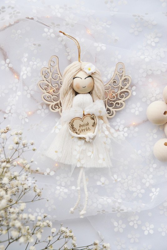 Delikatne włosy z naturalnych sznurków, subtelne drewniane skrzydła o misternym wzorze i lekka, kwiecista sukienka w białym odcieniu nadają mu niezwykłego uroku. W sercu aniołka znajduje się drewniane serduszko z napisem "Anioł Stróż" – symbol opieki, miłości i dobrych myśli.