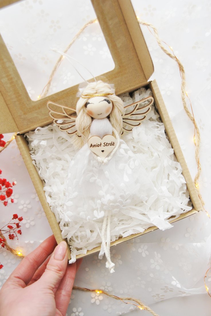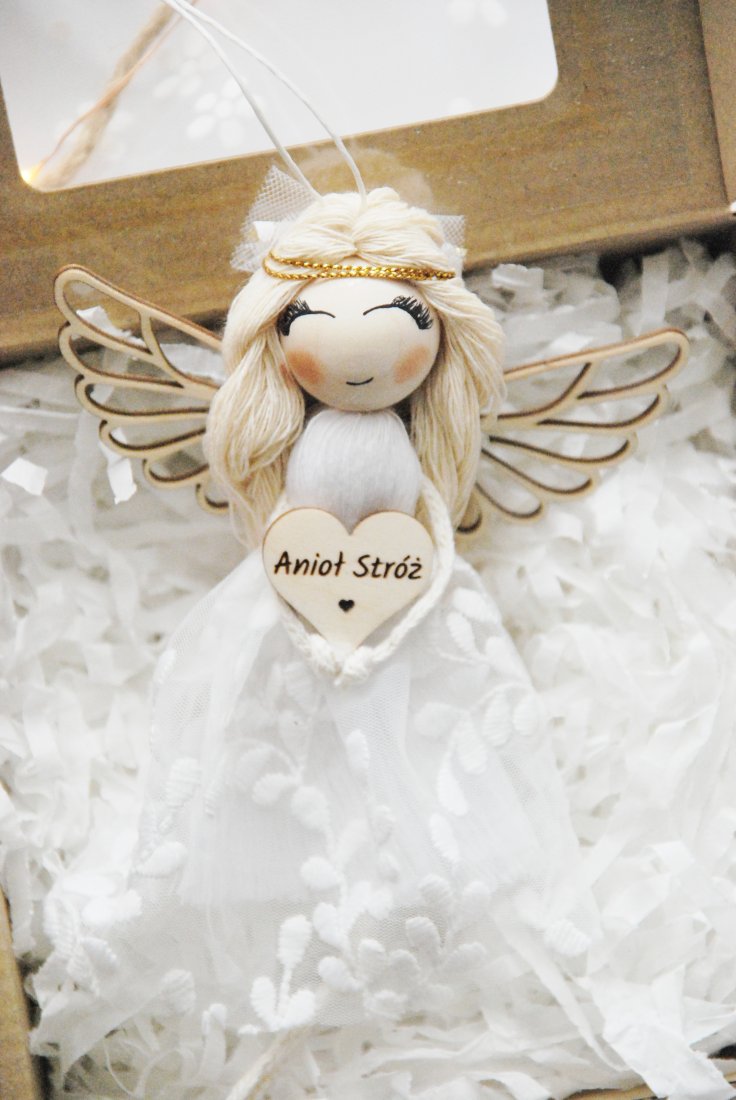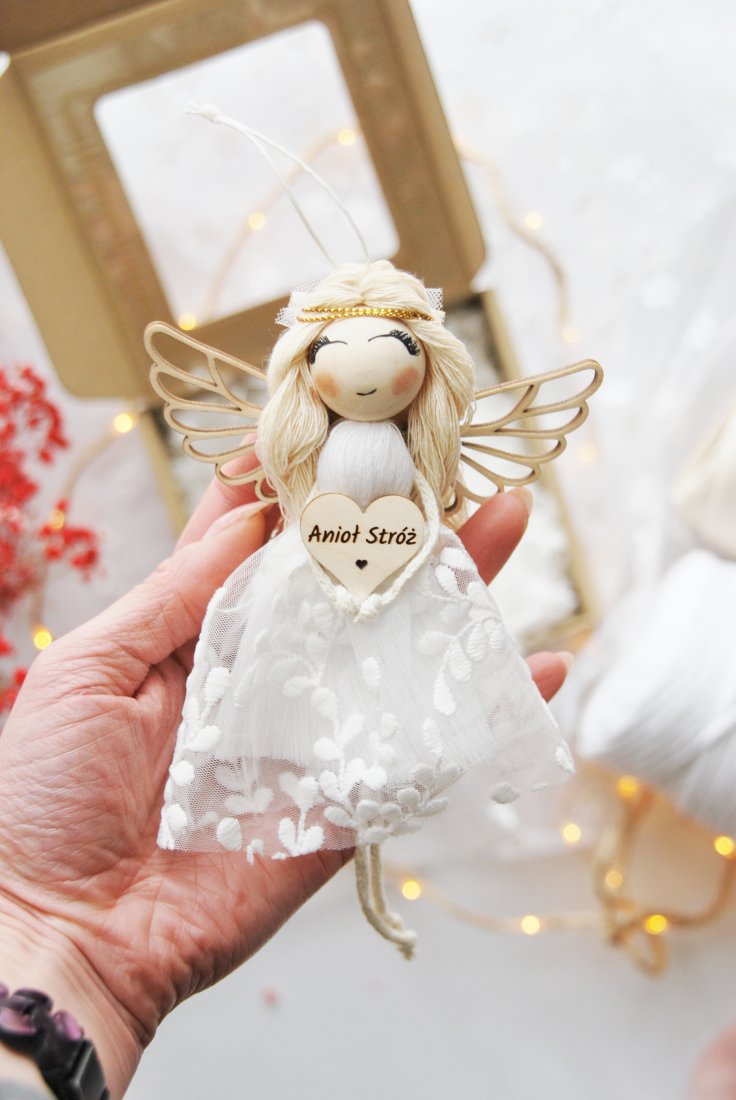 Wykonany z dbałością o każdy detal, zachwyca sukienką z koronki, drewnianą główką i skrzydełkami o subtelnym kształcie. Aniołek trzyma serduszko z napisem "Anioł Stróż", symbolizując opiekę i dobro, jakie niesie osobie obdarowanej.