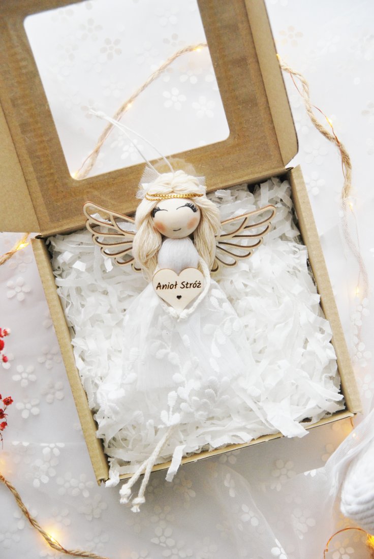 Aniołek jest starannie zapakowany w eleganckie pudełko z okienkiem – gotowy, by wręczyć go od razu po otrzymaniu.