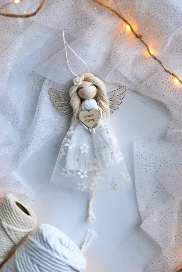 Wykonany z dbałością o każdy detal, zachwyca sukienką z koronki, drewnianą główką i skrzydełkami o subtelnym kształcie. Aniołek trzyma serduszko z napisem "Anioł Stróż", symbolizując opiekę i dobro, jakie niesie osobie obdarowanej.