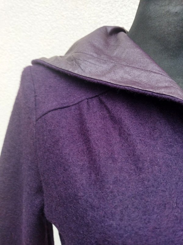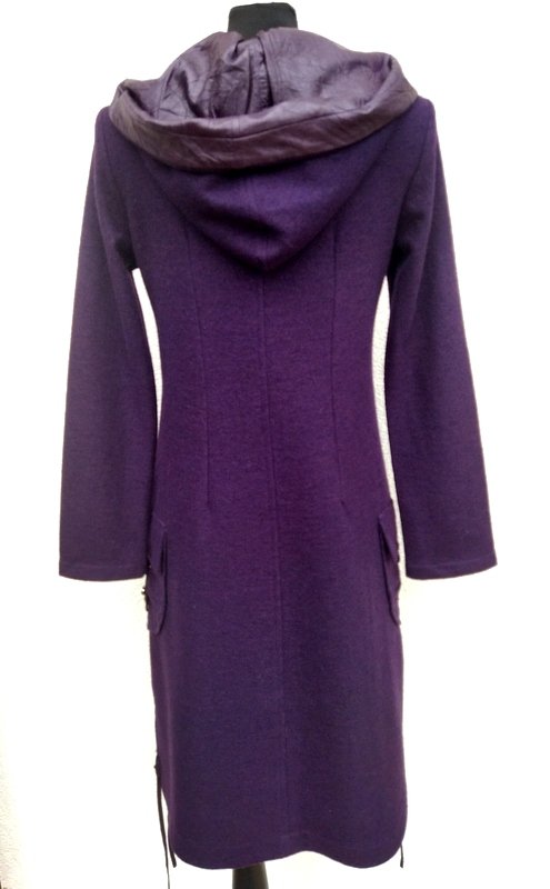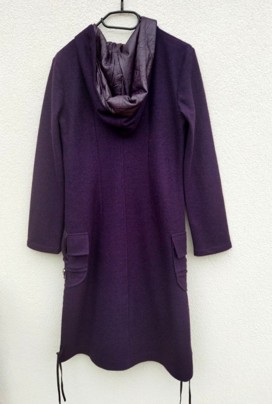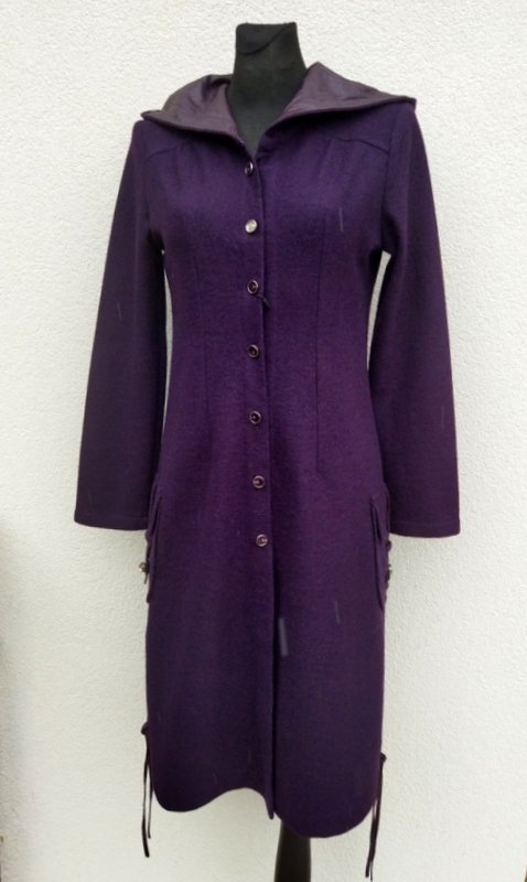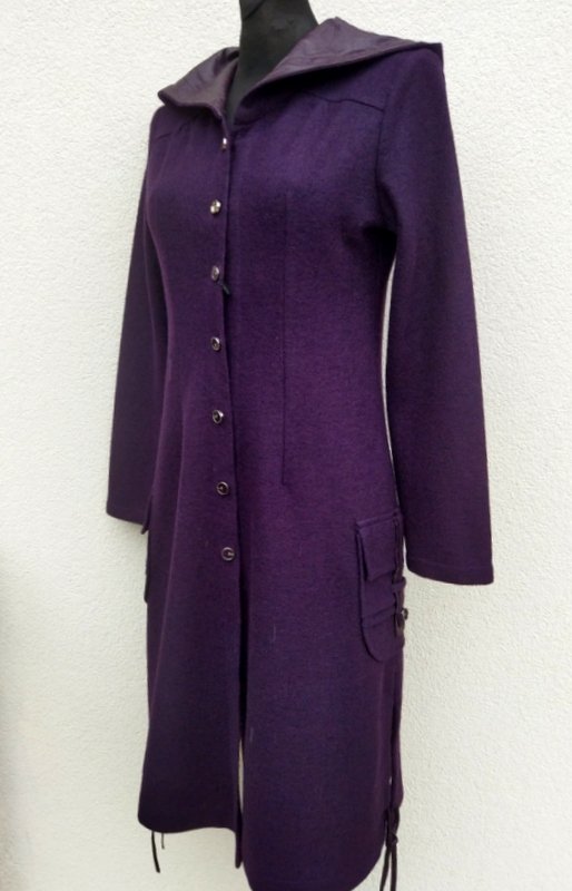 Świetny wiosenny płaszcz najprawdopodobniej z wełnianej tkaniny w nasyconym ciemno fioletowym kolorze , z elementami wykończeniowymi z tkaniny imitującej naturalna skórę ( wnętrze kaptura, paski na kieszeniach, troczki). Z kapturem , z dwiema naszywanymi kieszeniami , z rozcięciami po bokach wiązanymi na troczki. Zapinany na ozdobne guziki. Bez podszewki.
