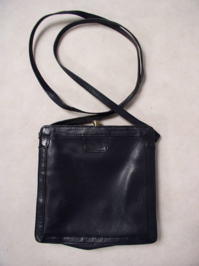 Mała torebka uszyta ze skóry naturalnej.Góra usztywniona ramą.Zapinana na bigiel.W środku jedna komora+kieszonka.Podszewka granatowa.Długi pasek do noszenia na ramieniu.Stan dobry,lekko powycierane rogi+podszewka w dwóch rogach wyszła lekko z ramy.Wysokośc 18 cm.szerokość 19 cm.pasek dł.125 cm.Kolor bardzo ciemny granat.