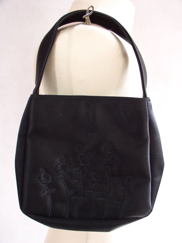 Mała,czarna torebka,wizytowa.Przód ozdobiony czarnym haftem.Góra zapinana na zamek.Podszewka czarna.W środku jedna komora+kieszonka na zamek.Stan bardzo dobry.Wysokość 17 cm.szerokość 17 cm.boki 7 cm.pasek dł.32 cm.