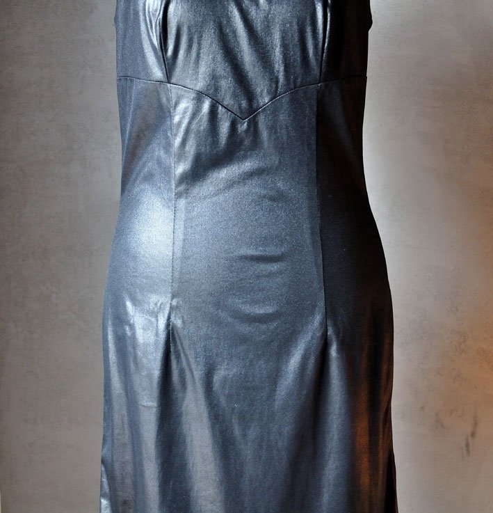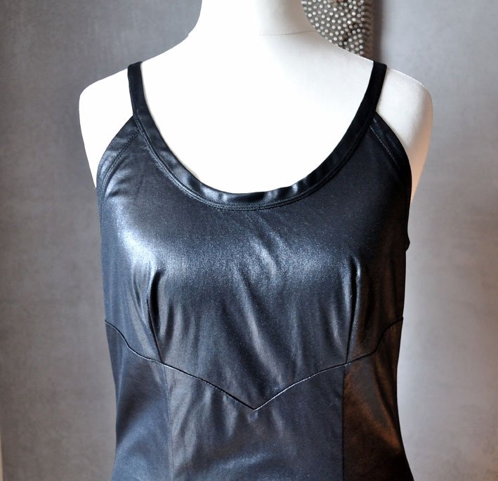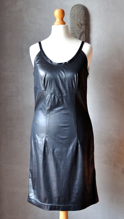 Ciekawie skrojona mała czarna z połyskującego (jakby woskowanego) materiału. Połysk typu wet look.