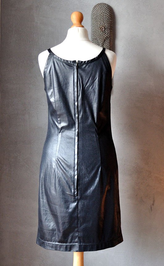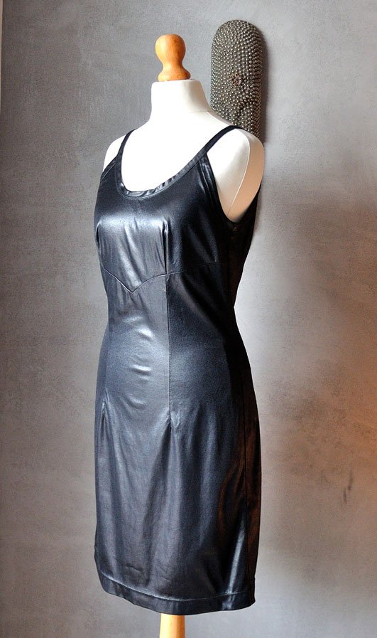 Ciekawie skrojona mała czarna z połyskującego (jakby woskowanego) materiału. Połysk typu wet look.