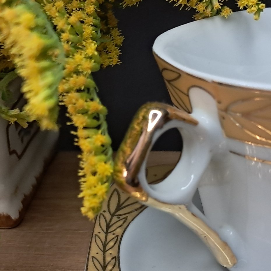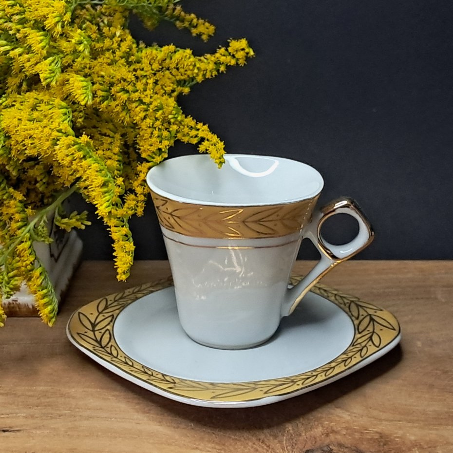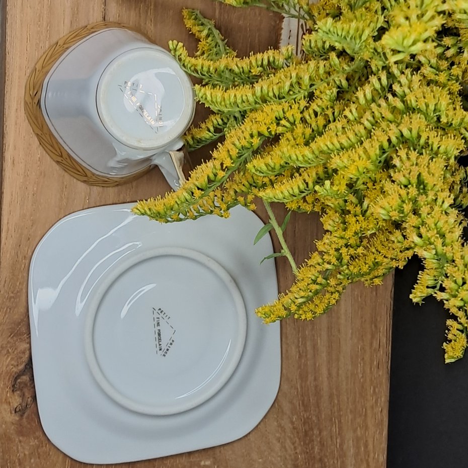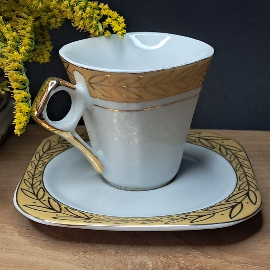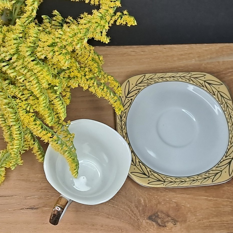 Biała filiżanka i kwadratowy spodek ze złoceniami.