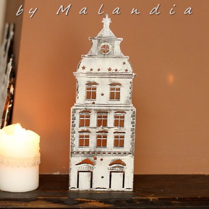 Urokliwa kamieniczka, która chętnie ozdobi półkę, kominek czy inne potrzebujące tego miejsce. Może też pełnić funkcję świecznika, postawione za nią tealighty wprowadzają niezwykły klimat, sprawdzi się tez jako ozdoba choinkowa.