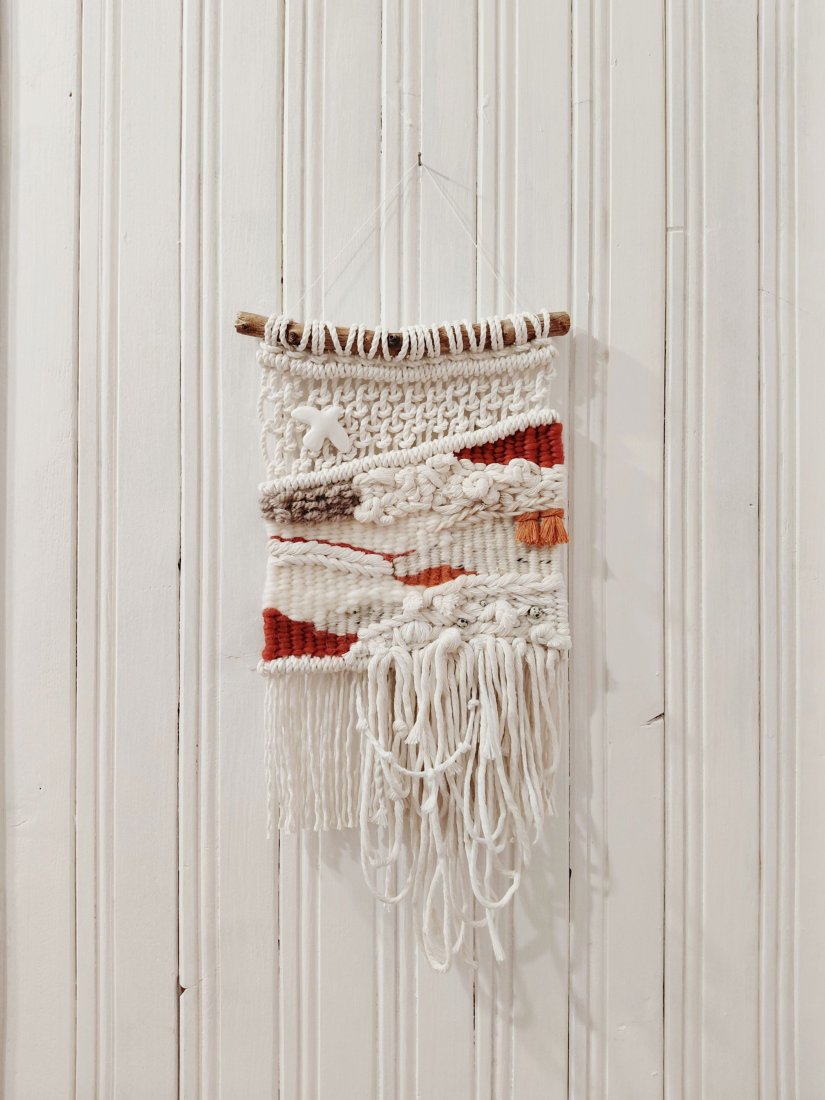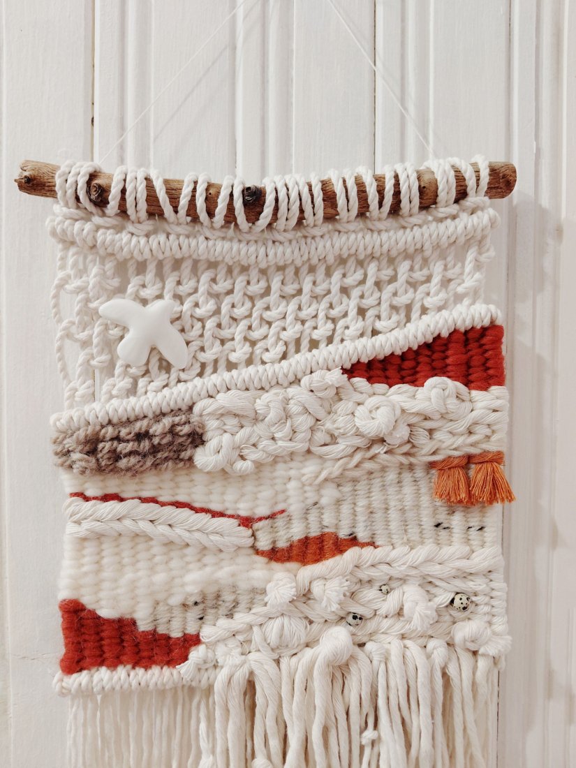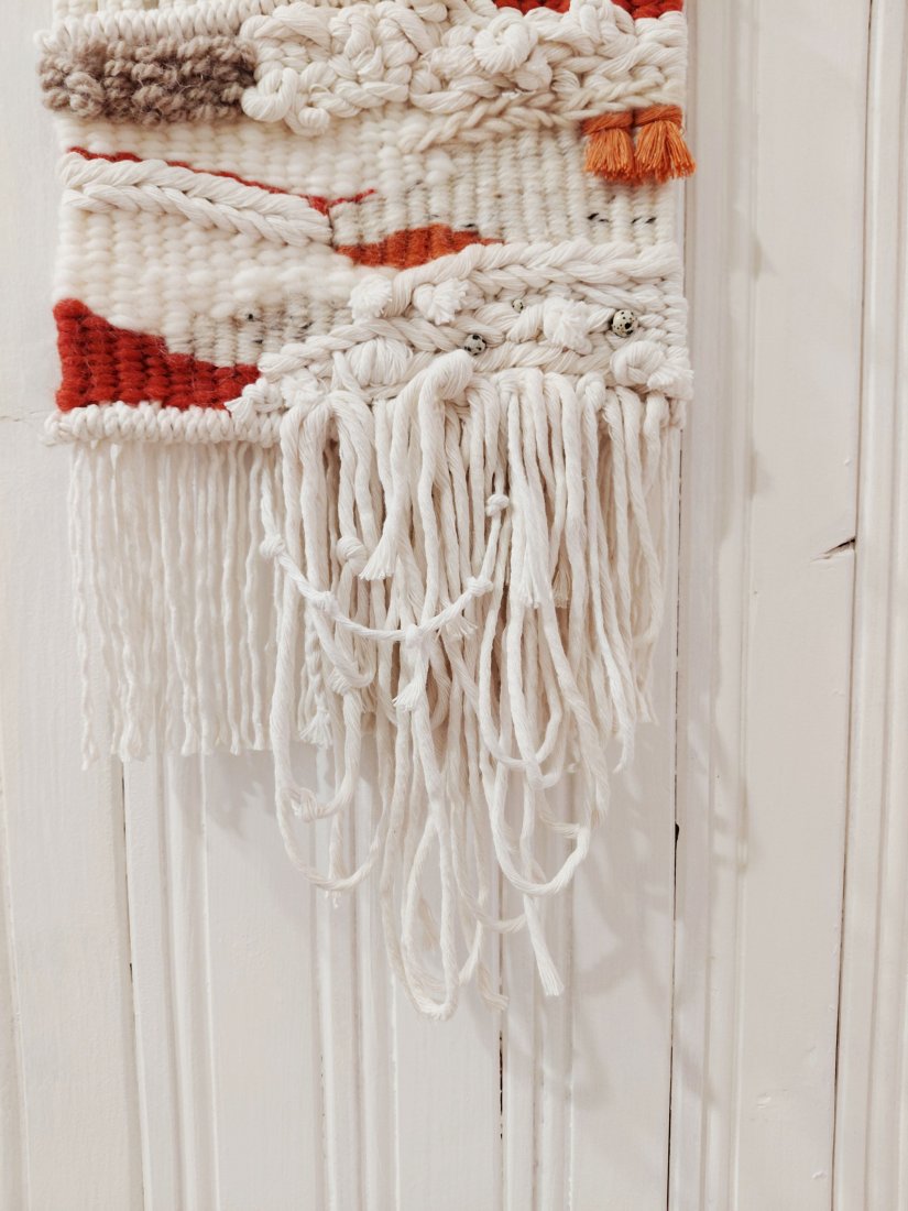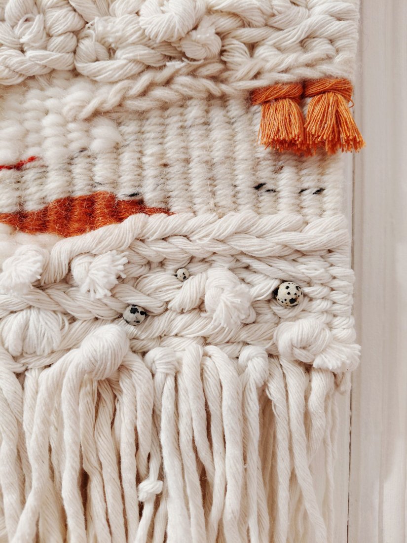Unikalna dekoracja ścienna z makramy wykończona wełną owczą i alpaki. Wykonana ręcznie przy użyciu naturalnych materiałów.