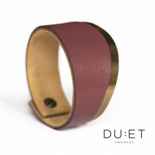 Starannie wykrojona i wykończona, urocza bransoletka wykonana od podstaw ręcznie z najwyższej jakości skór naturalnych: licowej w ciepłym, miodowym odcieniu złota (podstawa), miękkiej w kolorze czerwieni marsala i miękkiej jasnobrązowej, zamszowej wewnątrz. Zapinana na subtelny knopik kaletniczy w kolorze starego złota.