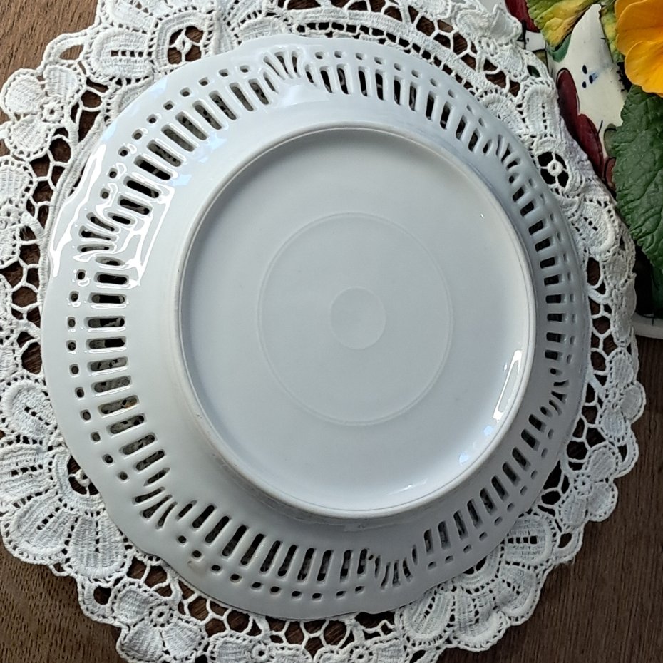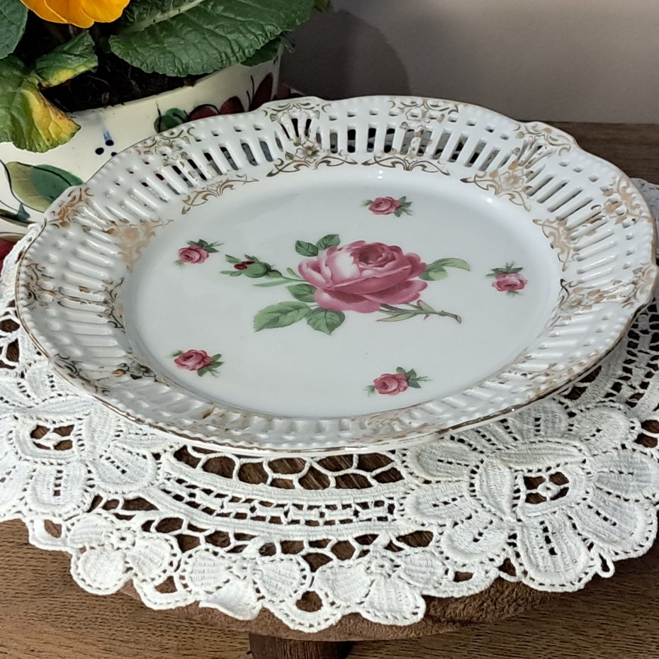 Niewielka paterka porcelanowa z dekoracyjnym ażurowym rantem i motywem róży.