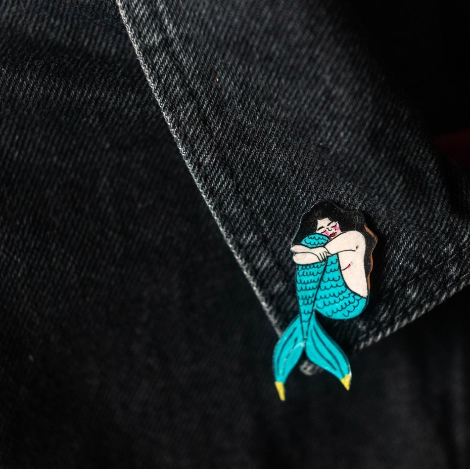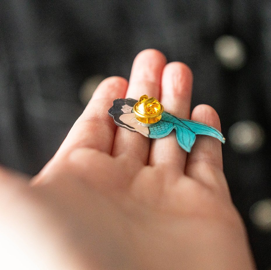 Przypinka z uroczą syrenką jest idealna do przypięcia na piórnik, ulubioną płócienną torbę, czapkę, kołnierzyk itd.