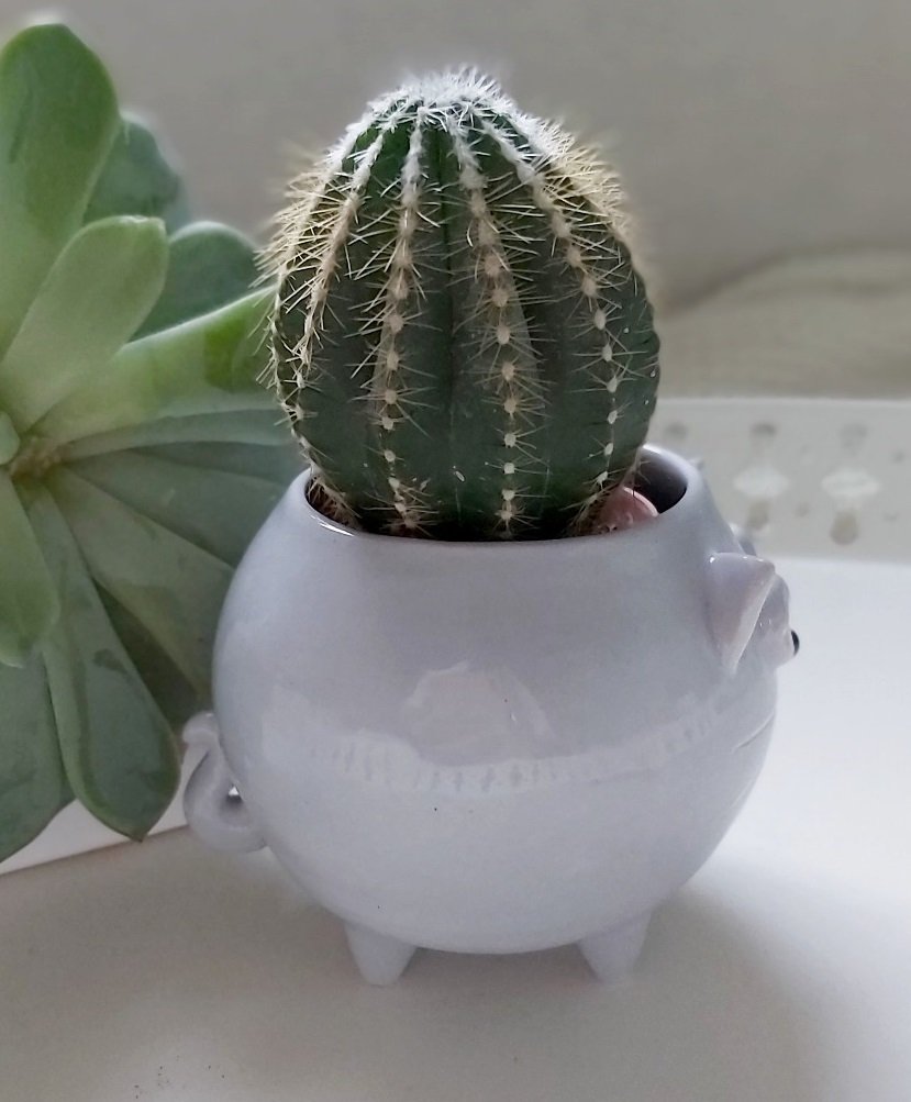 Ręcznie robiona, mała, szara doniczka ceramiczna w kształcie kota Kiziora. Pomyśl jak może wzbogacić Twojej wnętrze i skomponować się z Twoją ulubioną rośliną.