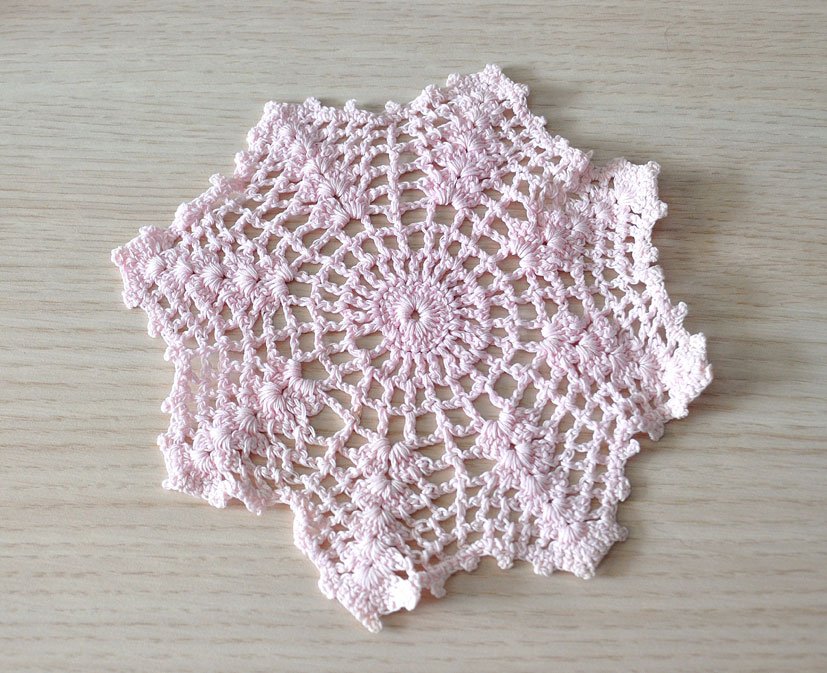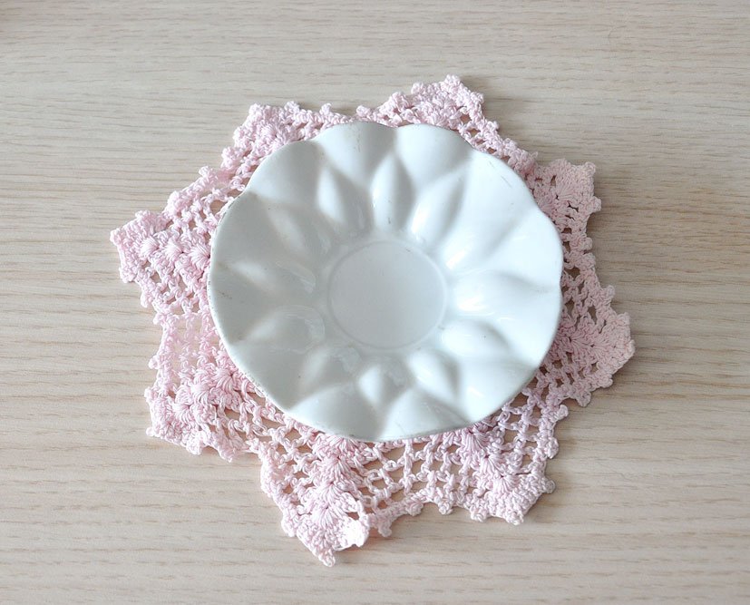 Niewielka, okrągła (w zasadzie w kształcie gwiazdki) serwetka w kolorze pastelowego różu. Jedyna taka, wykonana ręcznie. Wiekowa: ma kilkadziesiąt lat (co najmniej 40).