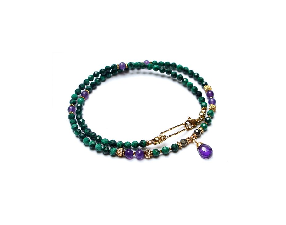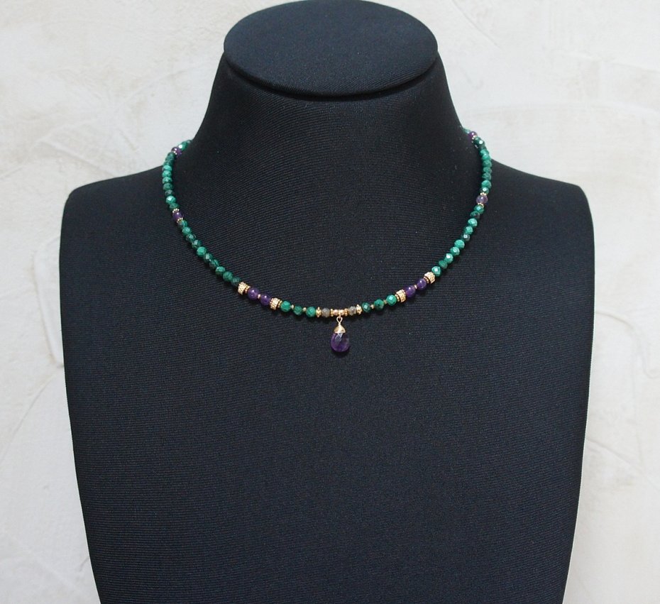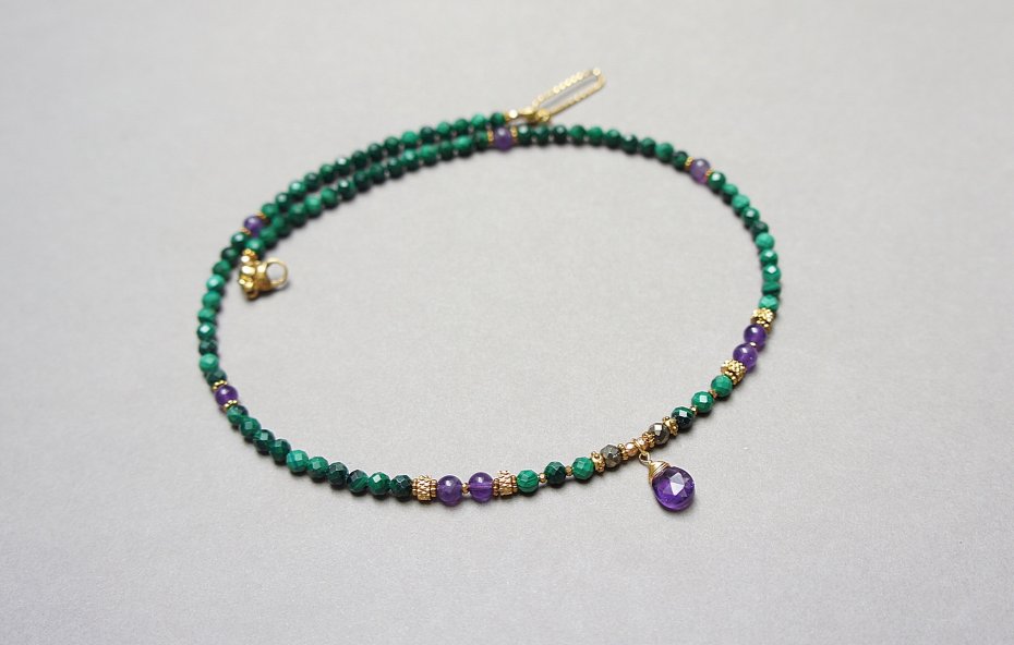 Krótki, delikatny naszyjnik wykonany w całości z pozłacanej stali szlachetnej oraz naturalnych, szlachetnych kamieni - malachity fasetowane [4mm], piryt fasetowany [4mm],hematytu fasetowanego, platerowanego [2mm], przekładek z hematytu [1mm], gładkich ametystów [5mm] oraz zawieszki z brioletki naturalnego, fasetowanego ametystu. Naszyjnik o długości ok. 42cm. Biżuteria ozdobnie zapakowana.