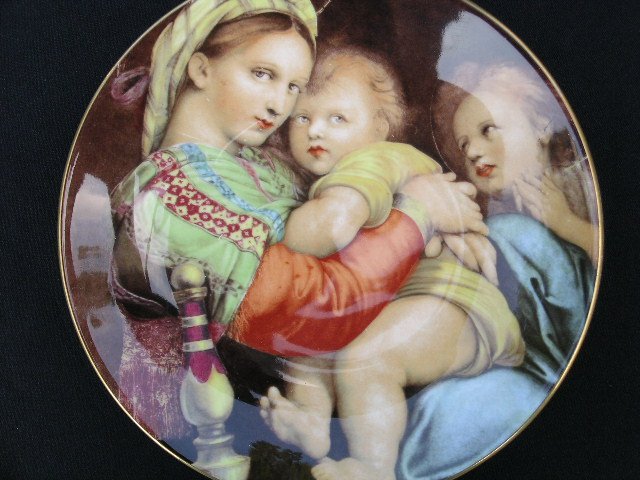 Porcelanowy talerz z reprodukcją renesansowej Madonny (Rafael). Sygnatura Staffordshire. Na błyszcząco szkliwiony, w półgłębokim kształcie, ze złoconym rantem. 19,5 x 3 cm. Stan zachowania dobry plus (drobne ślady użytkowania na malaturze).
