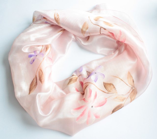 Zwiewny, jasnopudrowy szal w malarskie kwiaty. Materiał oceniam na jedwab naturalny lub sztuczny.