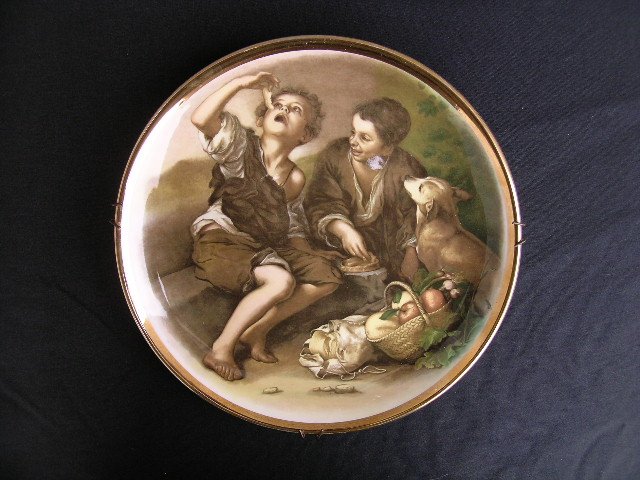 Niezwykle dekoracyjny duży talerz, sygnowany Lord Nelson Pottery - jakość porcelany i zachwycająca malatura ze złoconym rantem. Reprodukcja barokowego obrazu Bartolomea Estebana Murillo (XVII wiek) pod niemal szklaną powłoką błyszczącego szkliwienia. Doskonała dekoracja na ścianę - z tyłu profesjonalny uchwyt do powieszenia. 26 x 3,5 cm. Stan zachowania bardzo dobry.