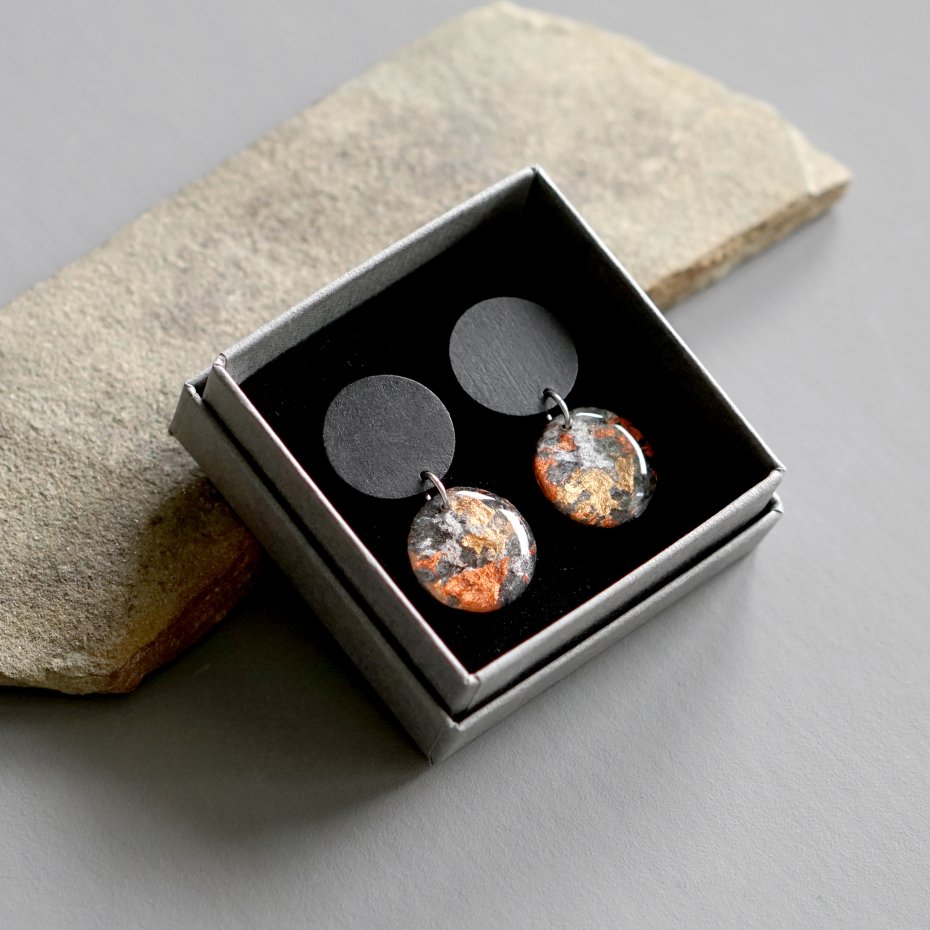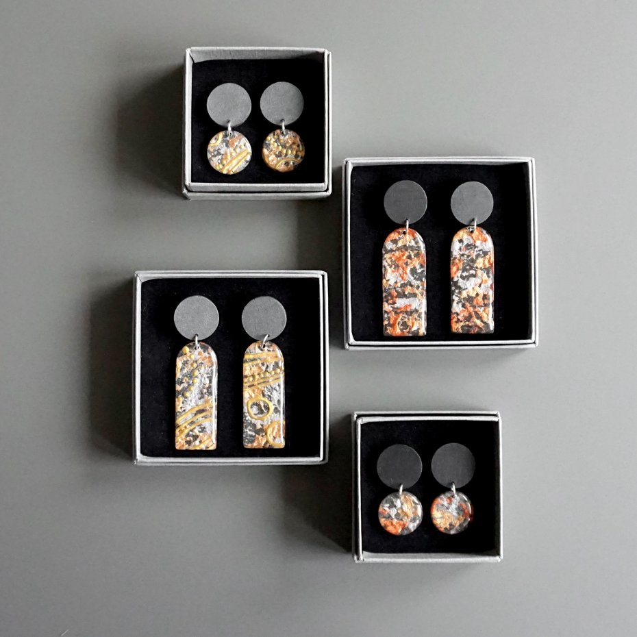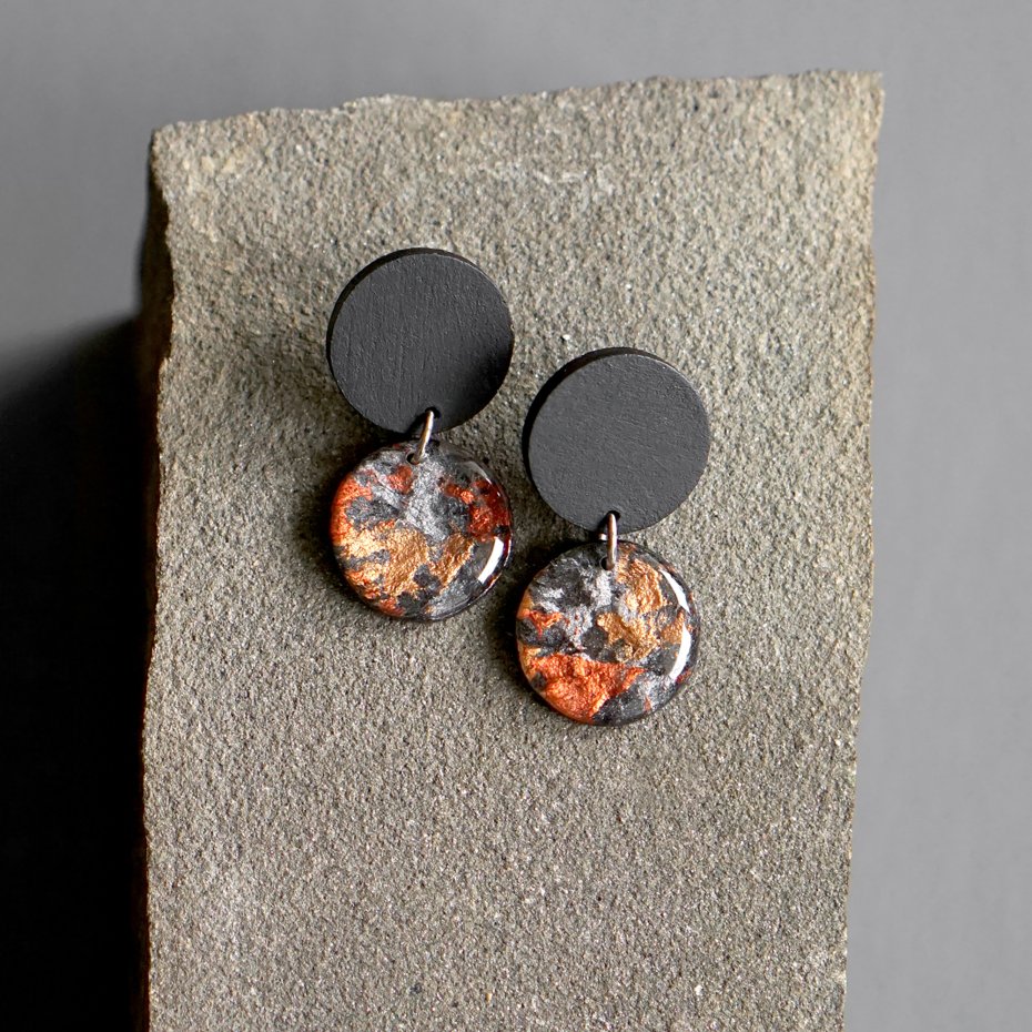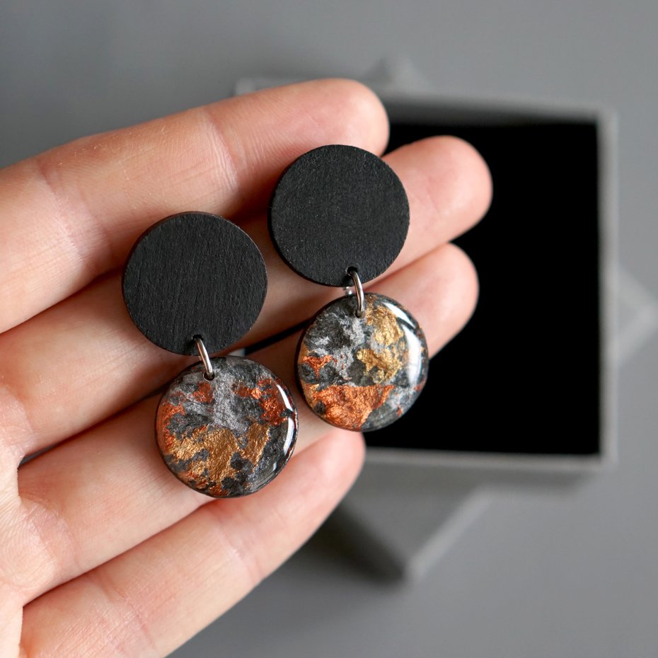 Małe abstrakcyjne kolczyki wykonane w całości w mojej pracowni w technice mieszanej - przy użyciu masy papierowej, drewna, żywicy i stali chirurgicznej.
