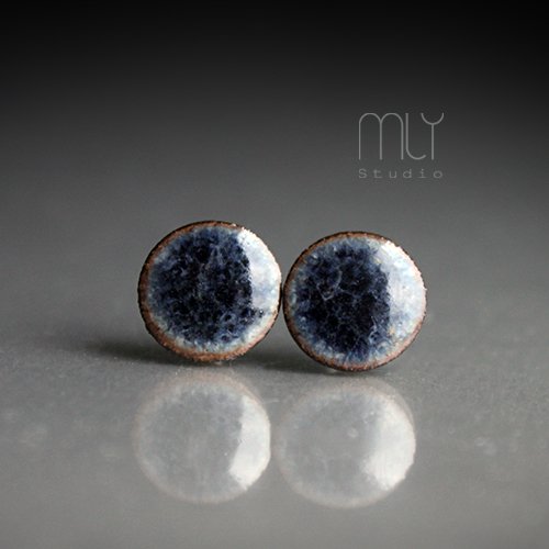 Ceramiczne okrągłe kolczyki w formie sztyftów, ręcznie wykonane z delikatnej czekoladowobrązowej gliny kamionkowej, jednostronnie szkliwione mieszanką granatowo szarychszkliw z efektem plamek, na antyalergicznych sztyftach w kolorze srebrnym. Średnica ok. 9mm. Polecam