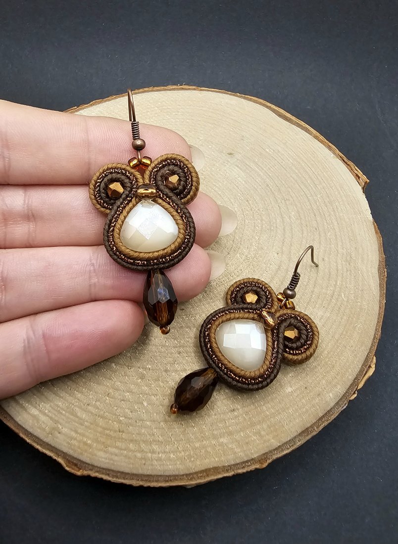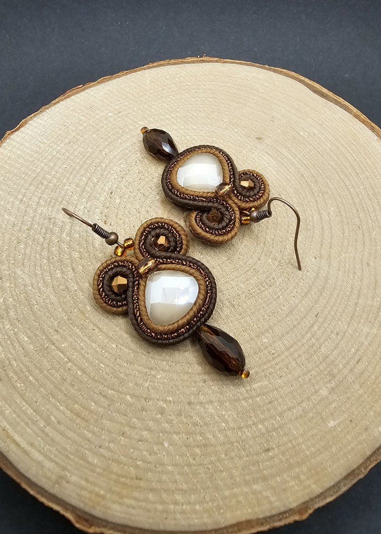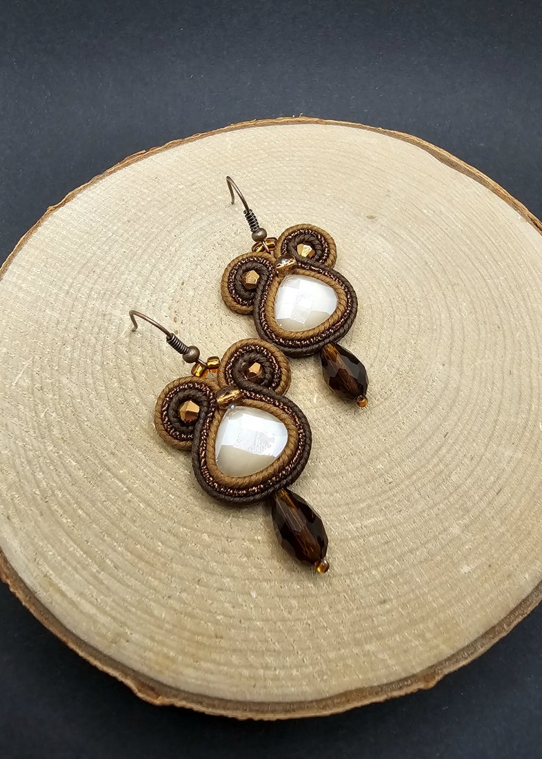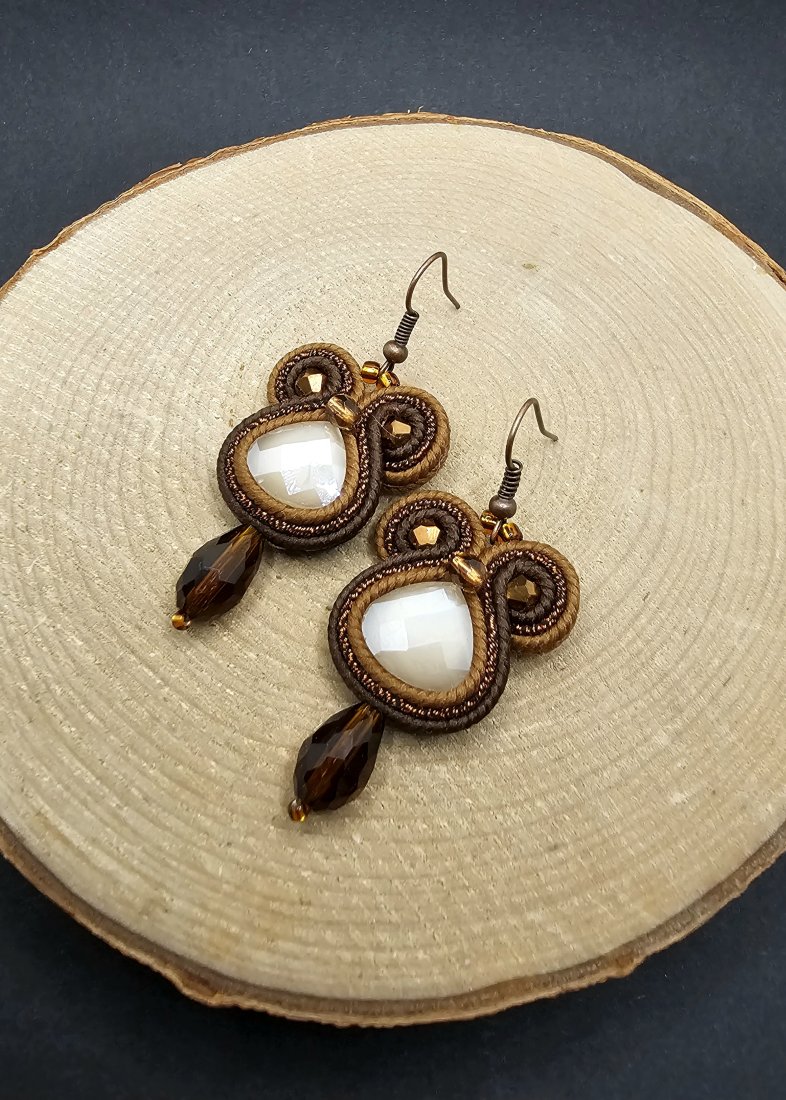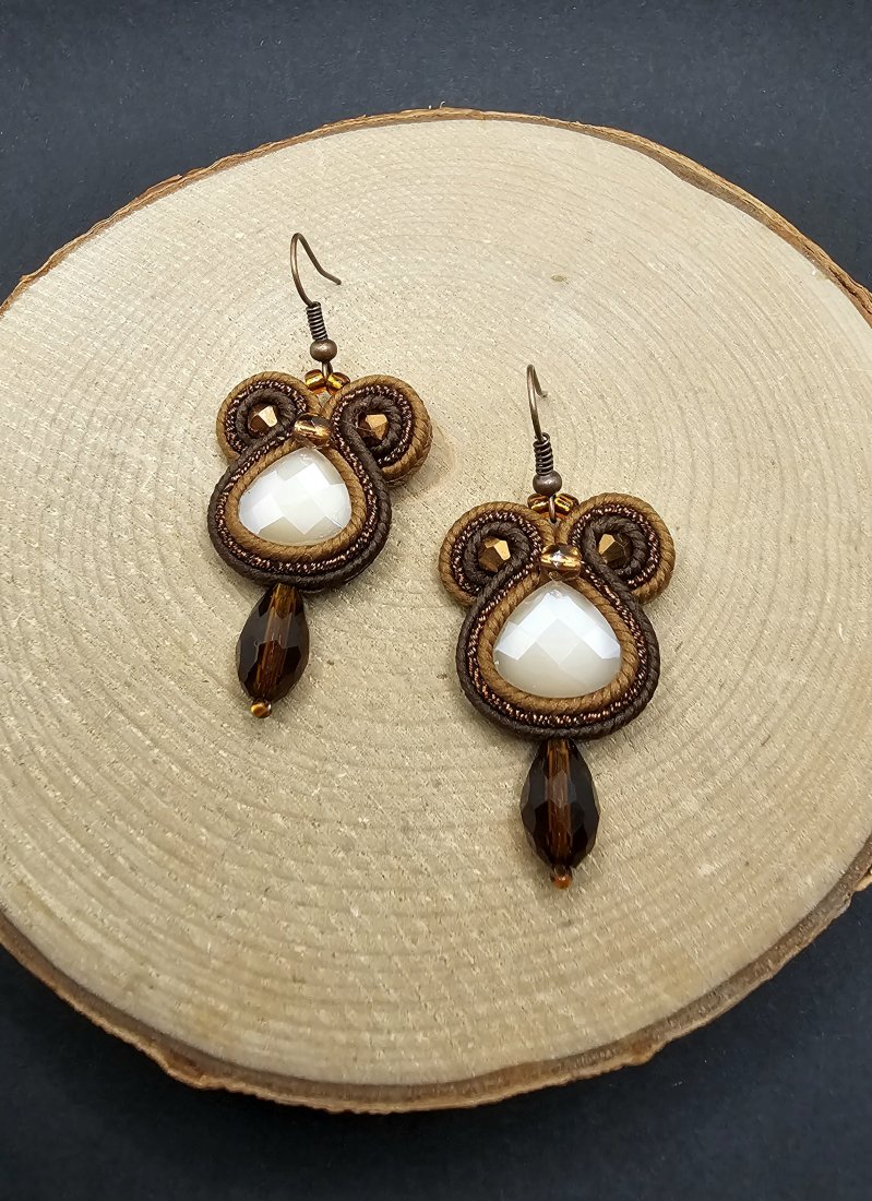 Szklane kryształki otoczone polskimi sznurkami sutasz oraz fasetowanymi koralikami. Dół kolczyków zdobią brązowe krople. Kolczyki zawieszone na klasycznych otwartych biglach w kolorze miedzi.