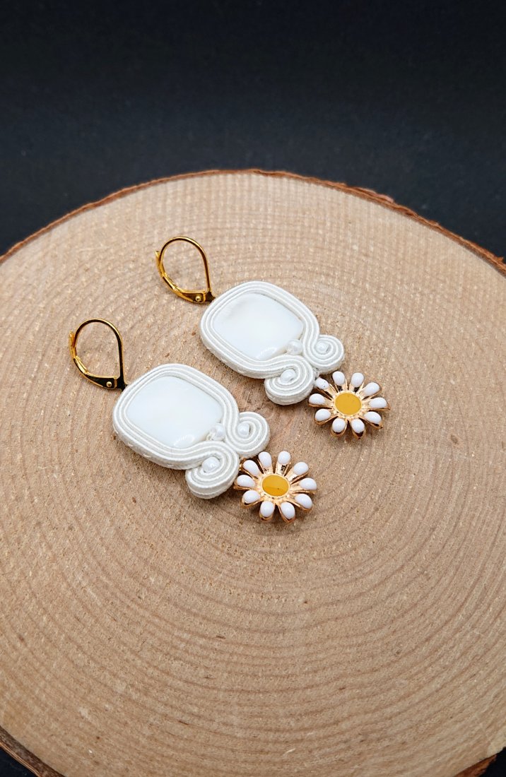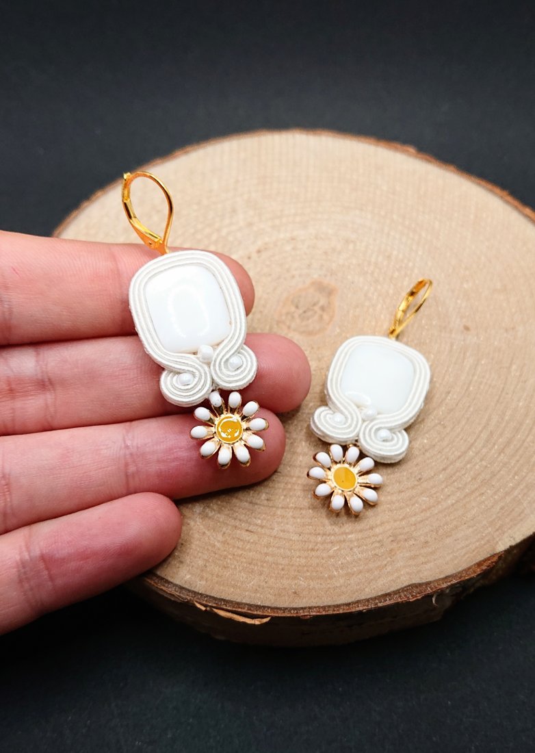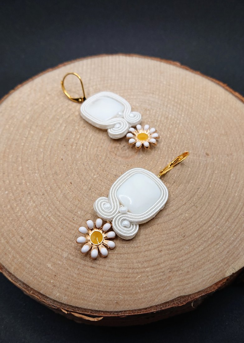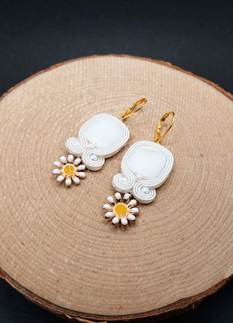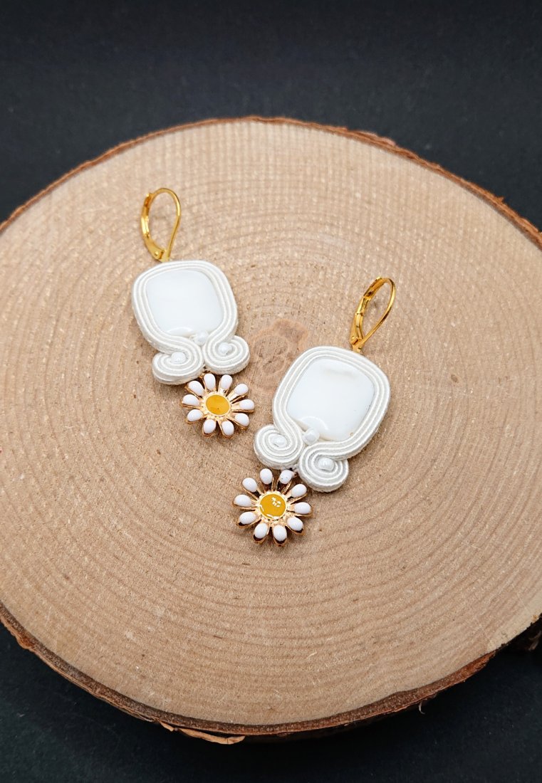 Kaboszony z muszli otoczone sznurkami sutasz oraz drobnymi szklanymi koralikami. Dół kolczyków zdobią metalowe zawieszki stokrotki. Kolczyki zawieszone na biglach angielskich w kolorze złota.