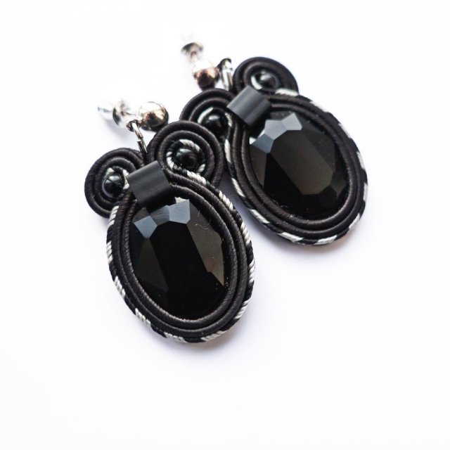 Kolczyki wykonane metodą haftu sutasz (soutache). Materiał: sznurki soutache, szklane , fasetowane kryształki, koraliki toho, bigle kulki - sztyfty Długość: ok 3,5 cm Kolczyki są wykończone na odwrocie czarnym filcem i zaimpregnowane Jeśli masz pytania- pisz :)