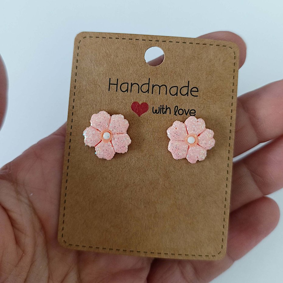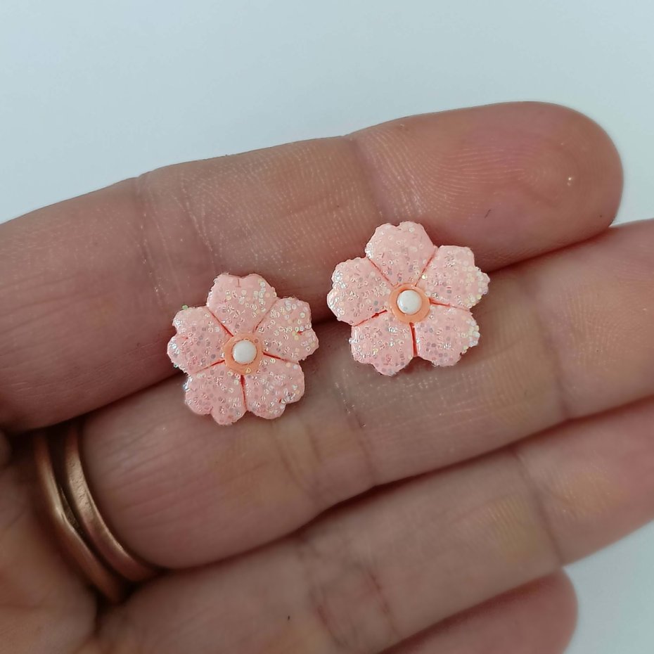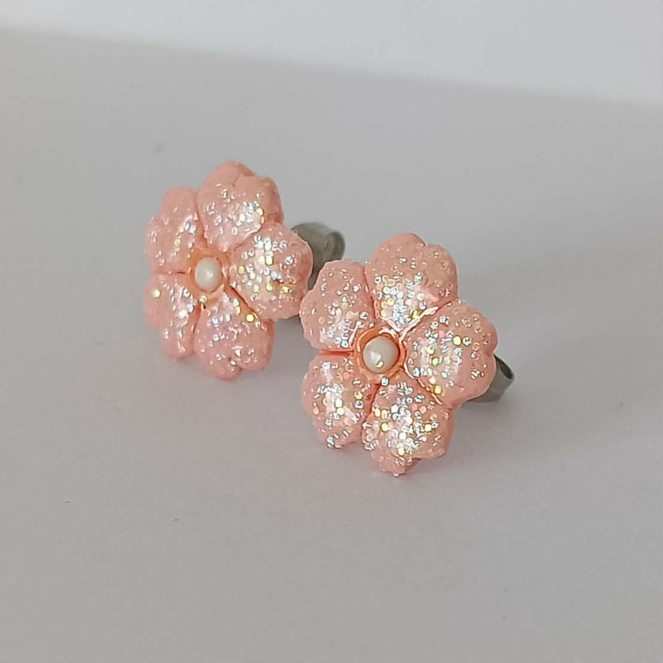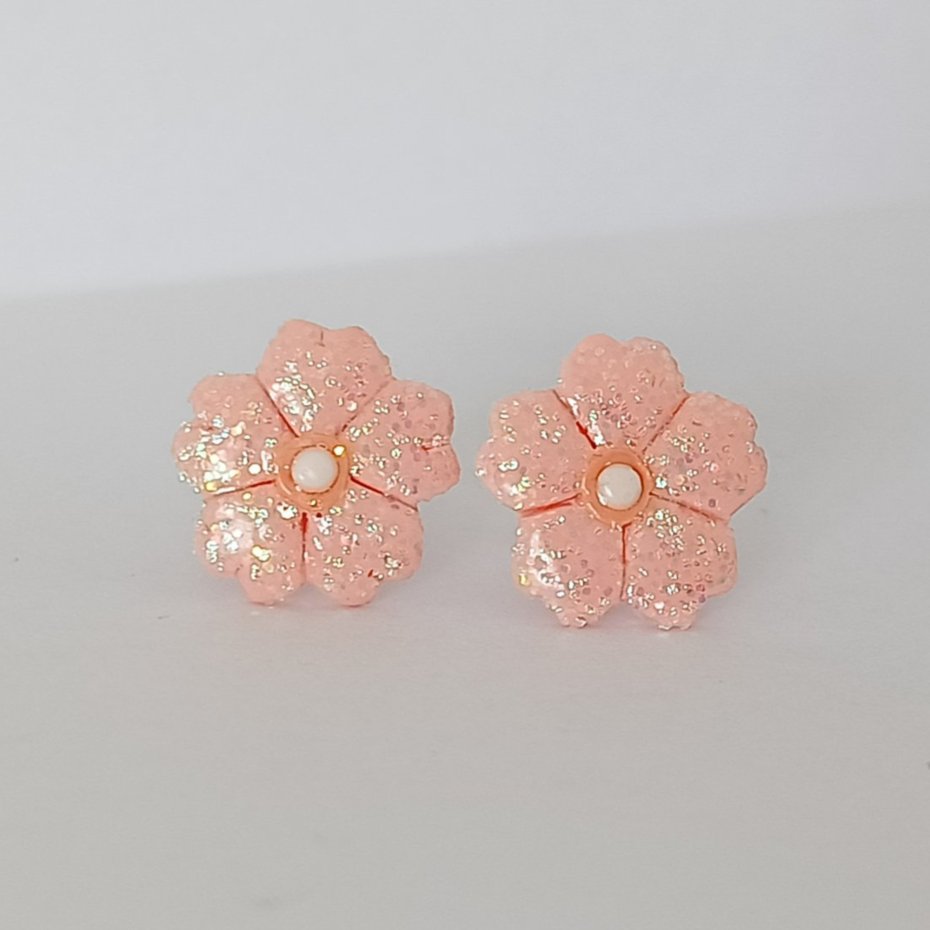 Urocze, ręcznie wykonane kolczyki w kształcie małych kwiatków w subtelnym, łososiowym odcieniu. Delikatny brokat nadaje im lekki połysk, dzięki czemu pięknie odbijają światło i przyciągają uwagę w bardzo subtelny sposób