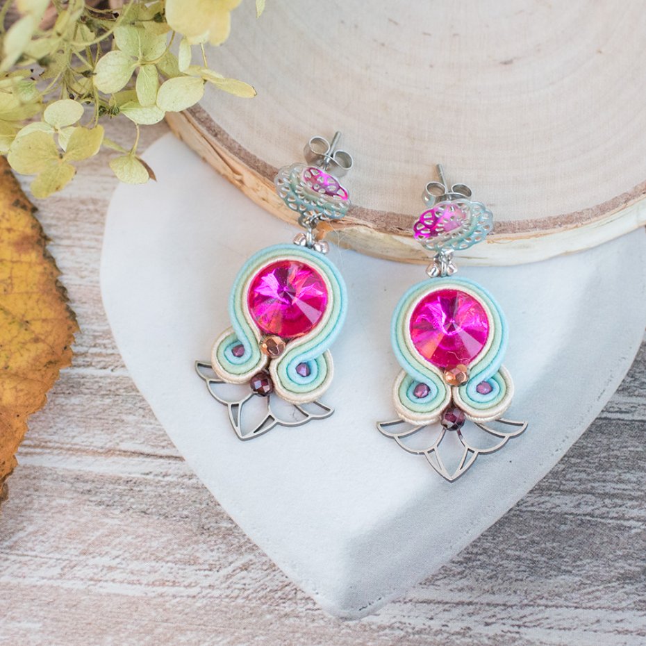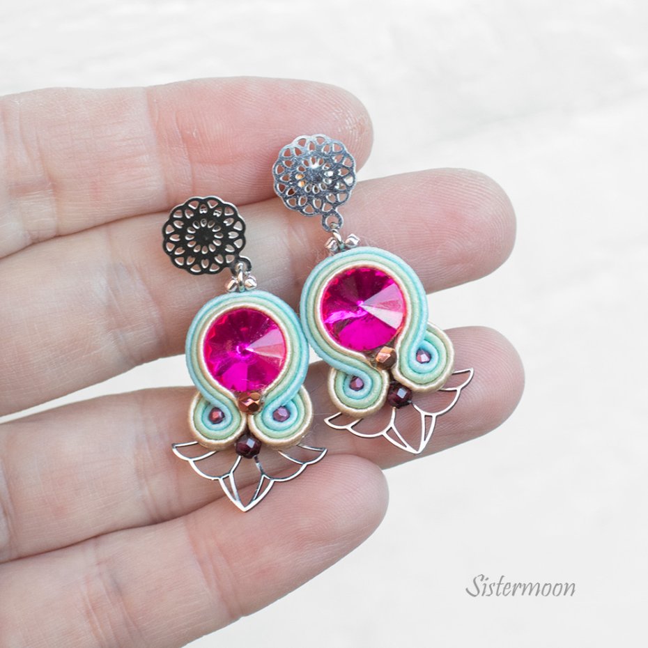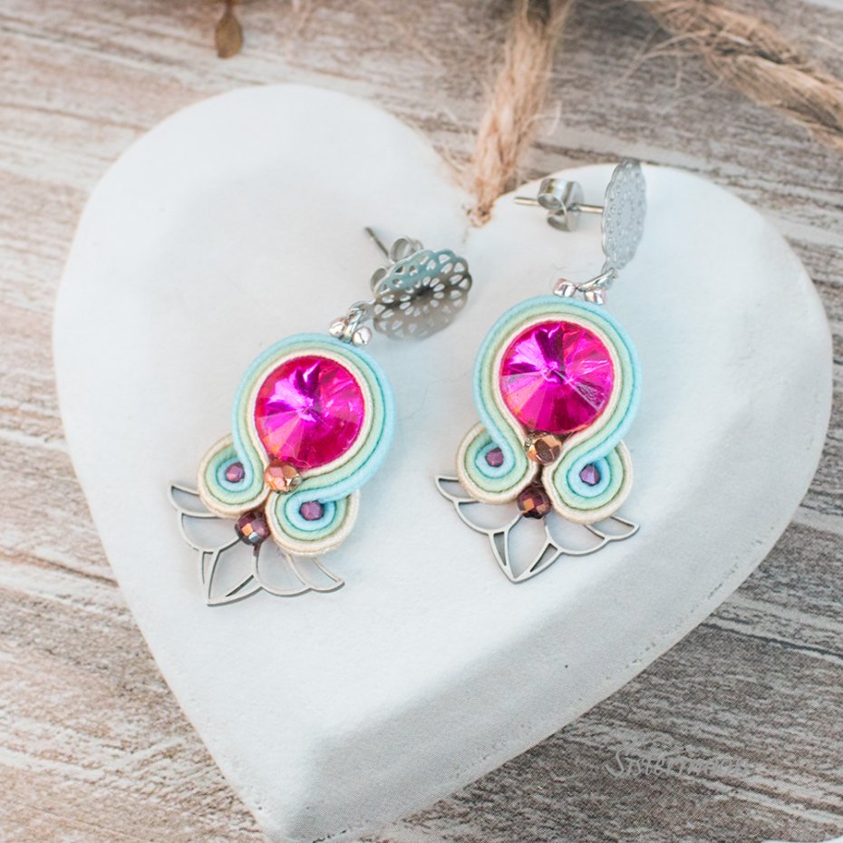 Małe kolorowe kolczyki sutasz Fuksja z dodatkiem błyszczących fasetowanych drobnych granatów. Szklane fasetowane kryształki rivoli, fasetowane szklane czeskie kryształki Fire Polish, Japońskie koraliki Toho z nieścieralną powłoką, stalowe liście, sutasz amerykański i czeski, ażurowe sztyfty stal szlachetna, spód wykończony naturalną skórką. Wysokość bez sztyftu 3 cm, szerokość 2 cm.