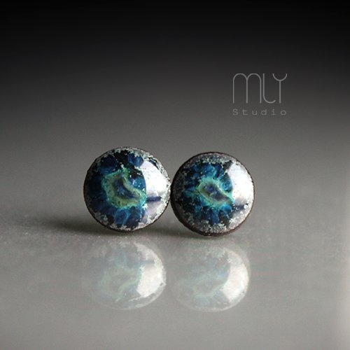Ceramiczne, lekko nieregularne kolczyki w formie sztyftów, ręcznie wykonane z delikatnej czekoladowobrązowej gliny kamionkowej, jednostronnie szkliwione efektownym błękitnozielonym błyszczącym szkliwem z efektem plamek, na antyalergicznych sztyftach w kolorze srebrnym.Średnica ok 6mm. Polecam
